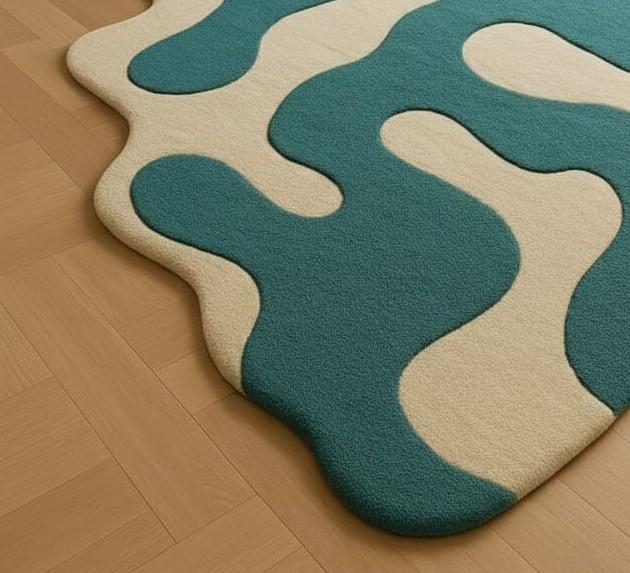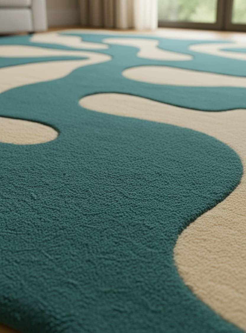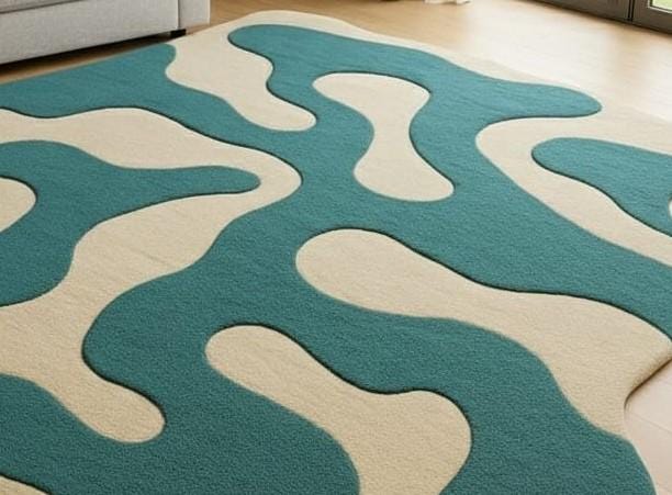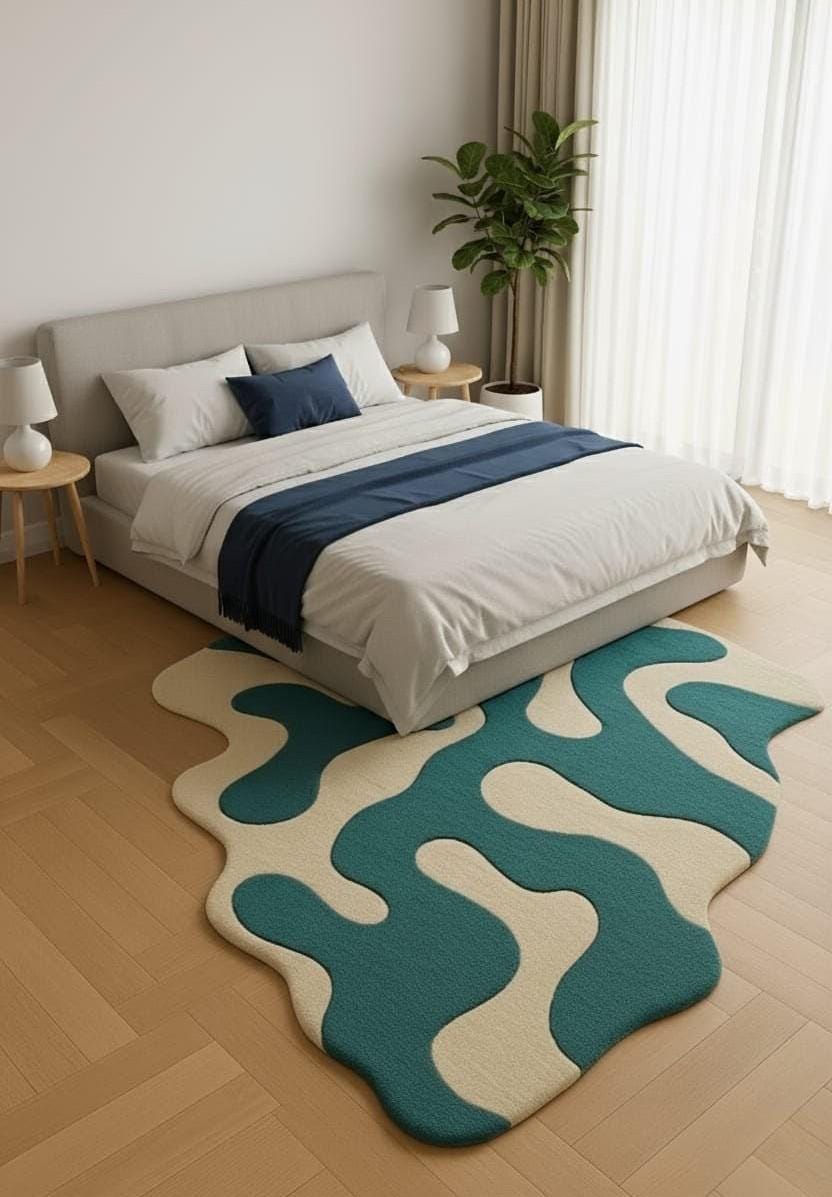 Bring a touch of modern artistry into your home with this Wavy Abstract Teal & Cream Rug, beautifully crafted to elevate contemporary living spaces. Designed with a unique free-flowing shape and smooth organic curves, this rug becomes an instant statement piece—perfect for bedrooms, living rooms, lounges, and stylish studio spaces.