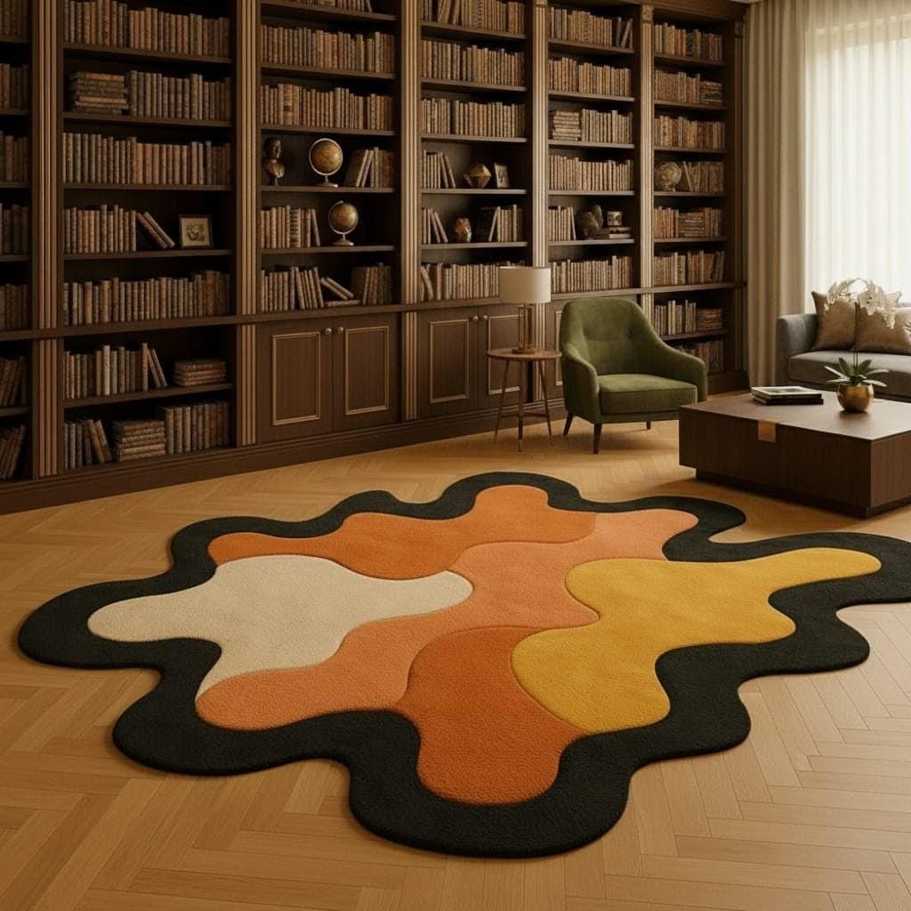 Transform your home with this Modern Abstract Wavy Area Rug, designed to bring bold style, warm tones, and artistic charm to any room. Featuring a unique splash-shaped silhouette with yellow, orange, cream, and black accents, this rug becomes an instant statement piece in living rooms, bedrooms, libraries, lounges, offices, and creative studios.