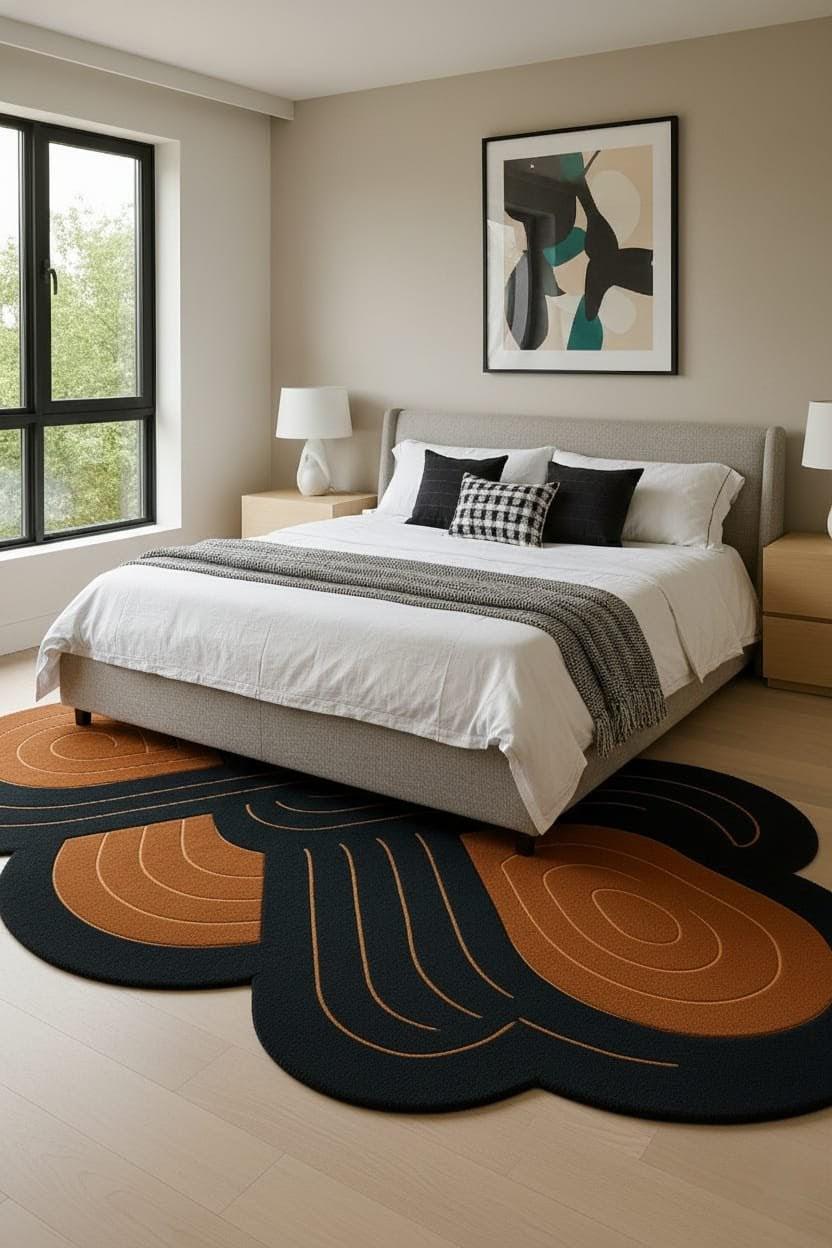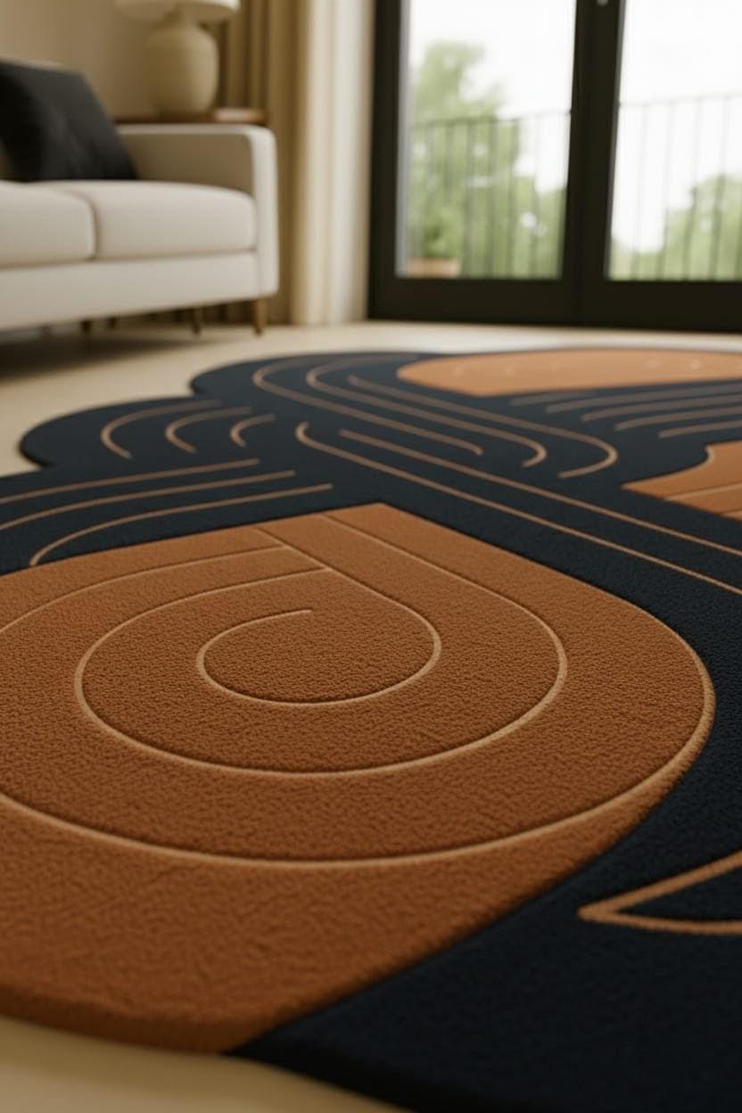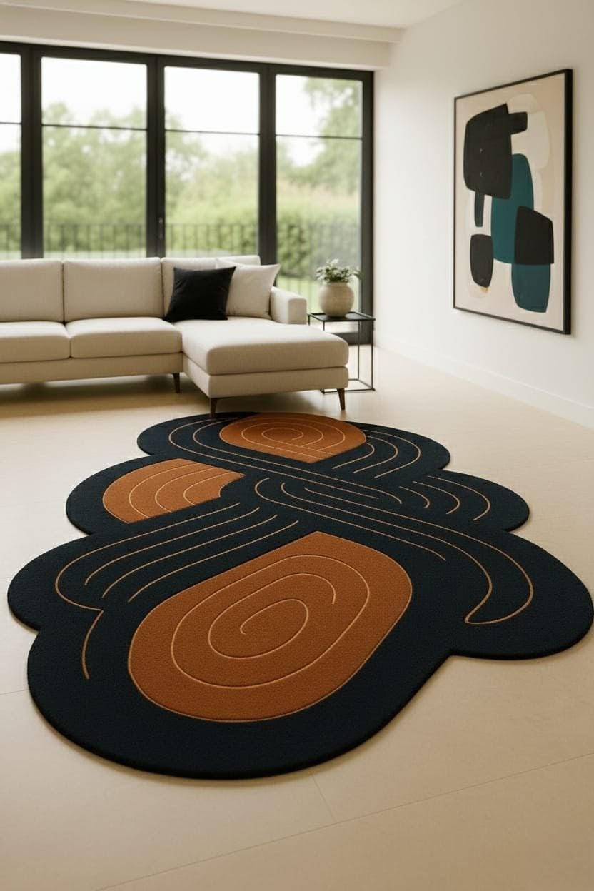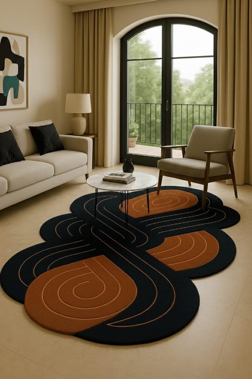 Transform your space with this Modern Abstract Curve Area Rug, designed for homes that love bold style and sculpted detail. Featuring a deep black base, rich rust accents, and elegant curved contour lines, this rug becomes a statement centerpiece in any dining room, living room, or bedroom.