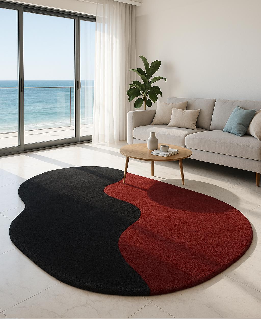 This modern abstract irregular rug is a perfect blend of art, balance, and contemporary design. Inspired by the yin-yang concept, the flowing curves and bold contrast of black and deep red create a powerful visual impact while maintaining harmony and sophistication.