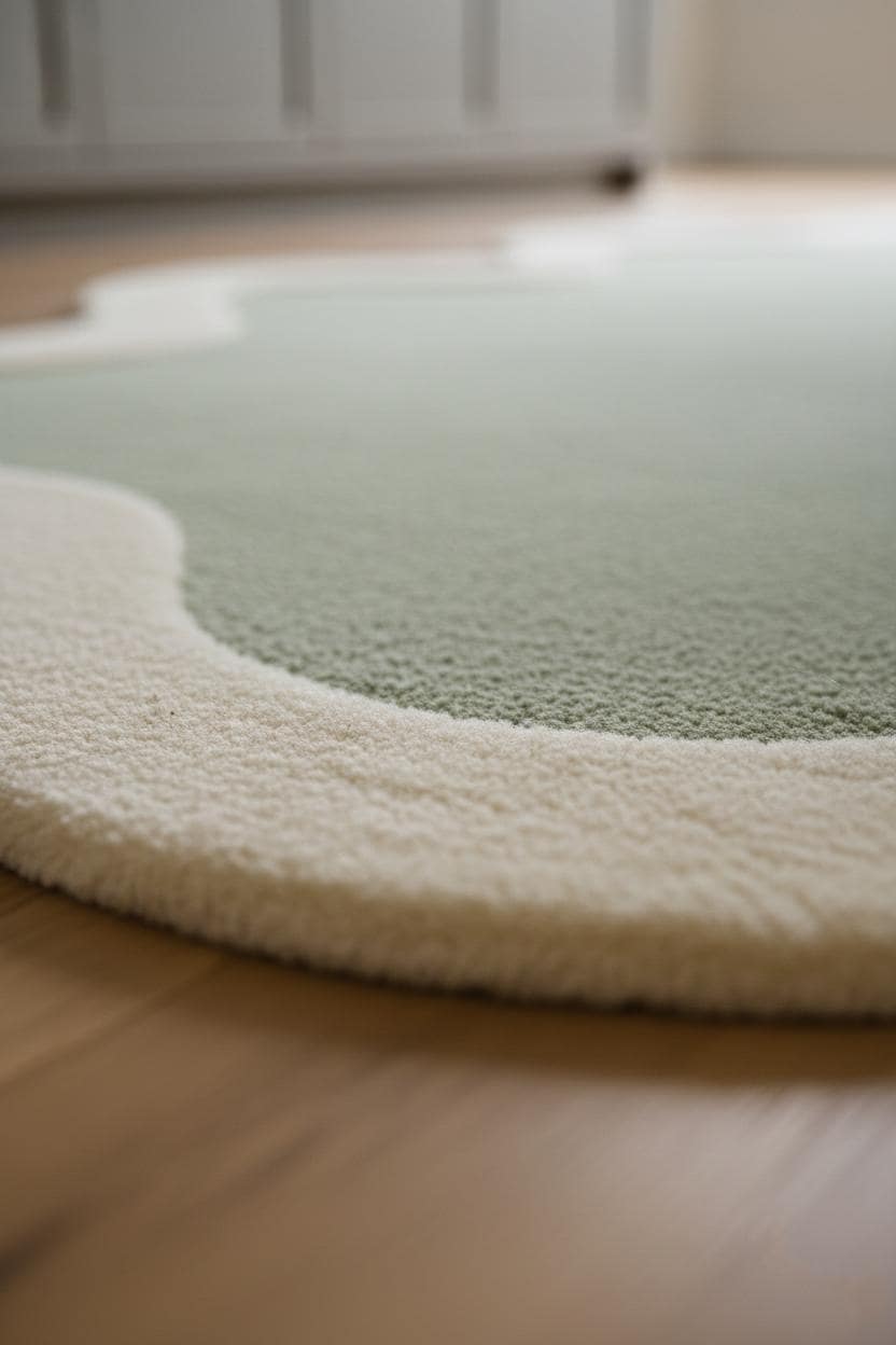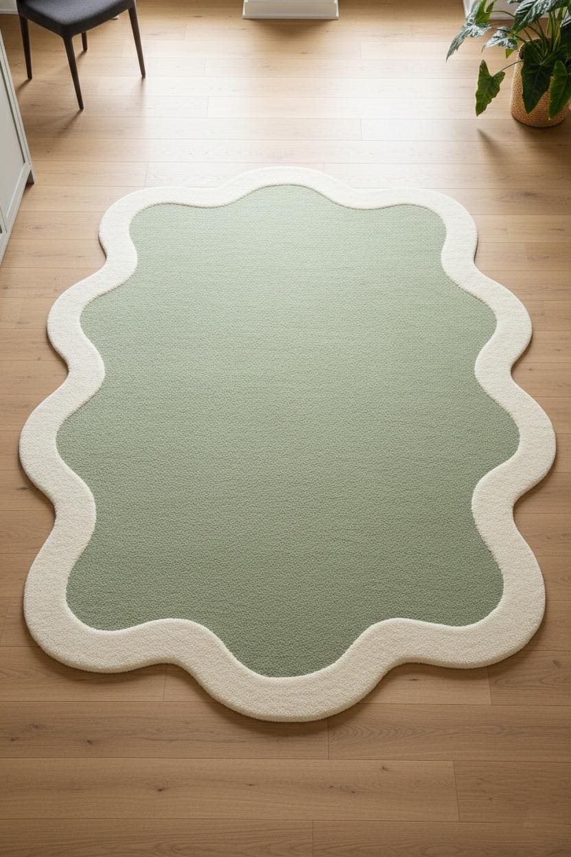 Add a soft, modern touch to your home with this Scalloped Sage Green Area Rug, designed with an elegant wavy ivory border that brings warmth and sophistication to any space. Perfect for contemporary, minimalist, and modern interiors.