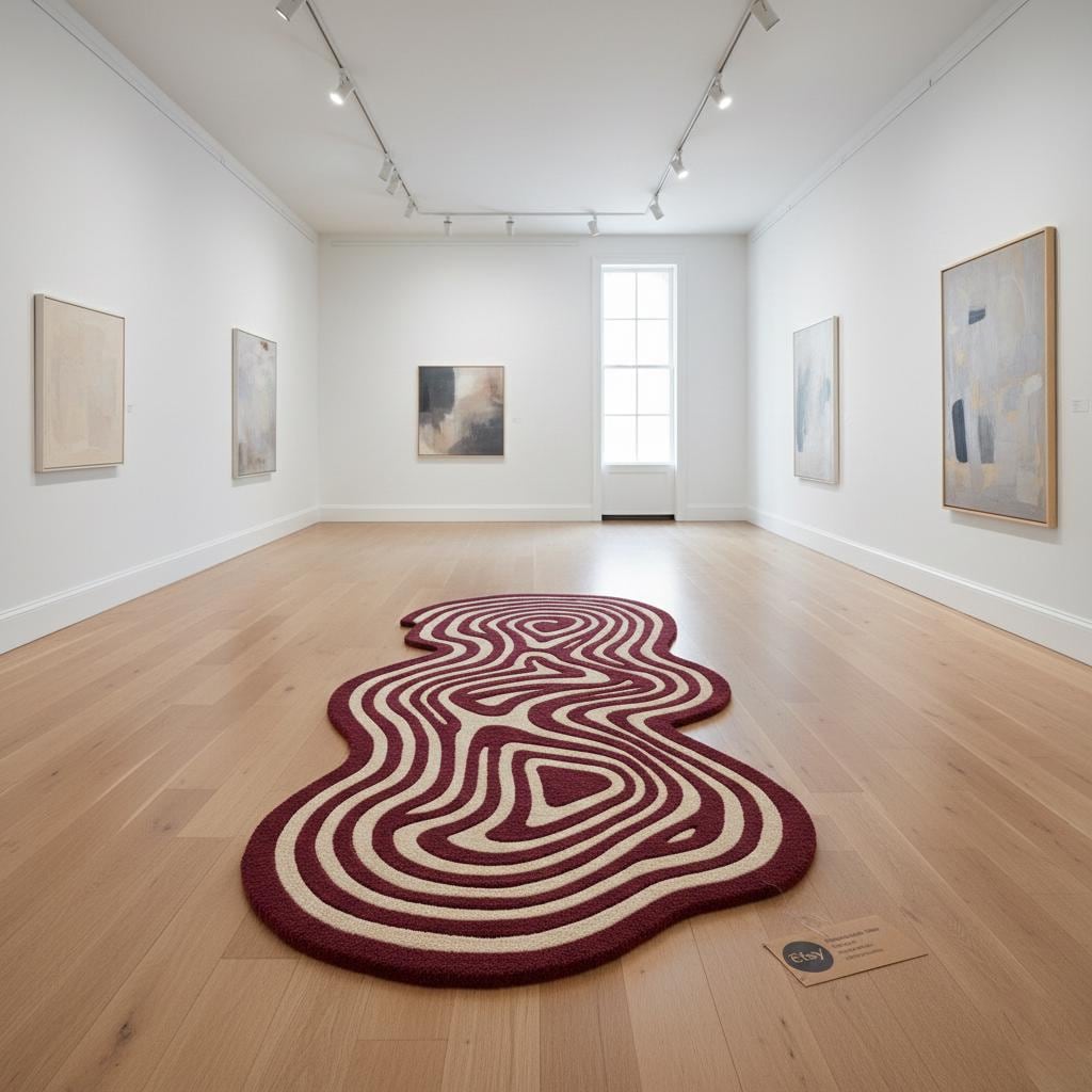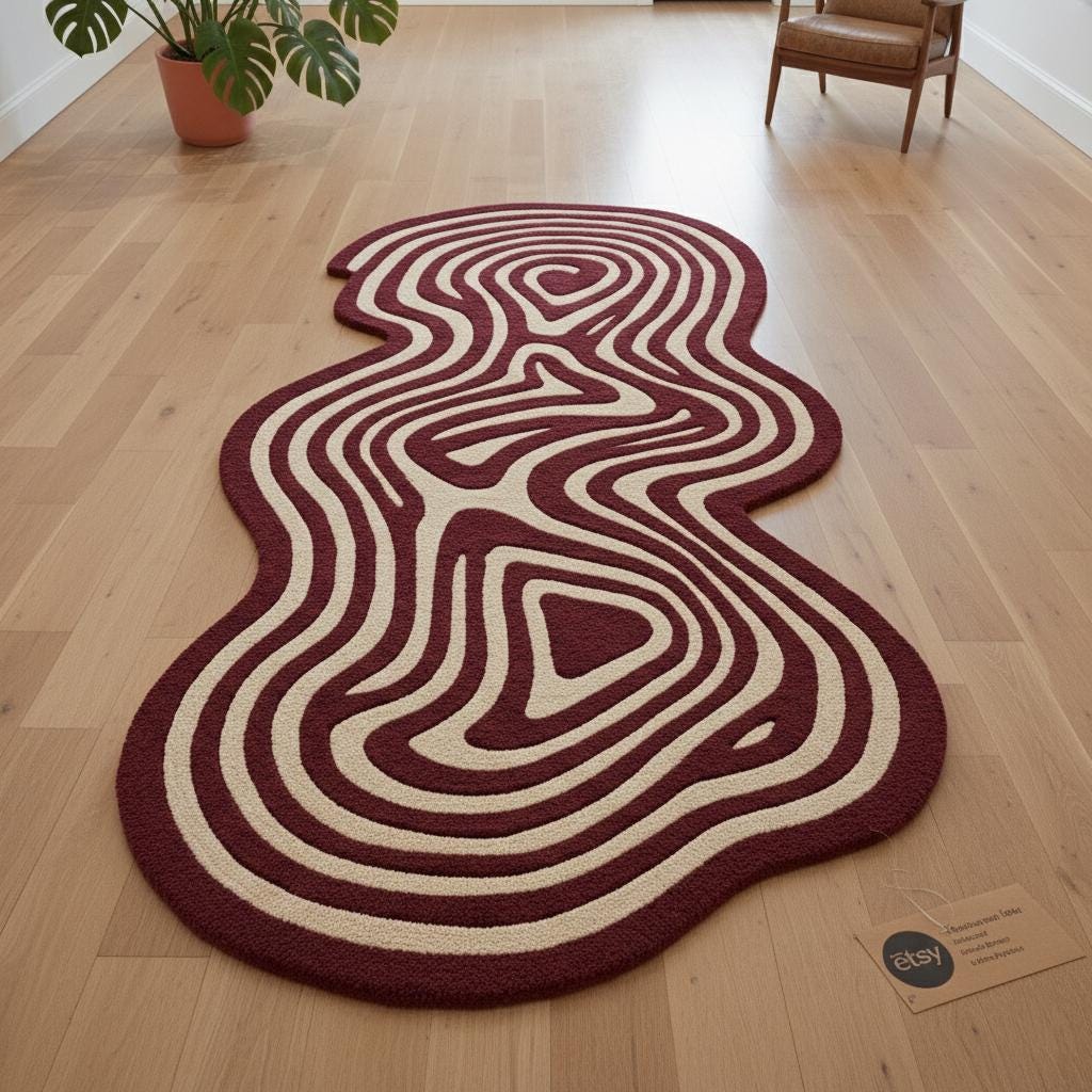 This stunning hand-tufted abstract rug features flowing wavy lines in rich burgundy and cream tones, inspired by modern art and organic shapes. Its sculptural silhouette makes it a perfect statement piece for contemporary interiors.