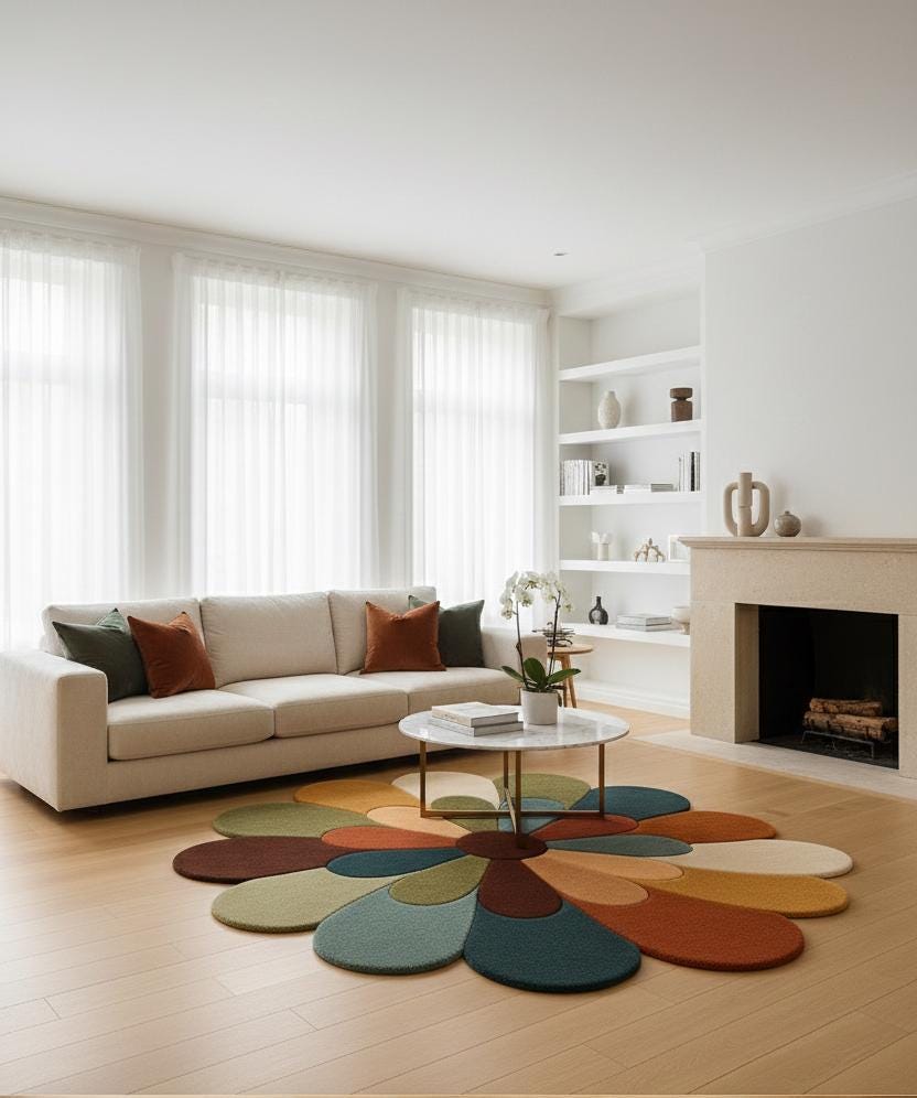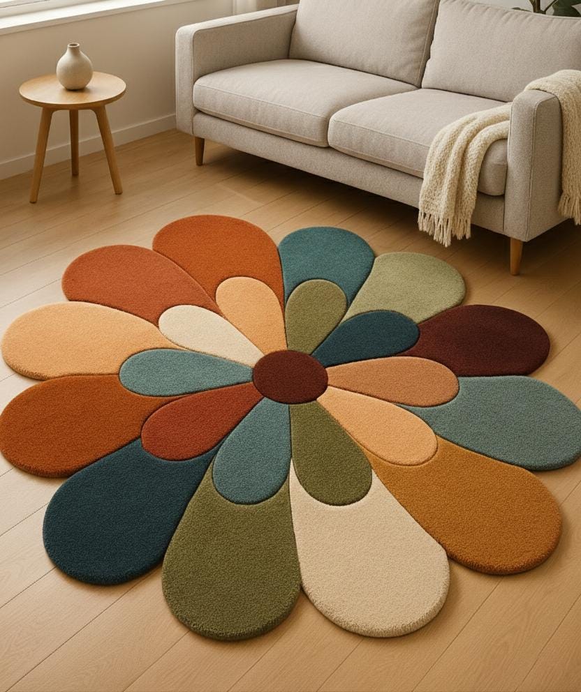 Bring warmth, color, and artistic charm to your space with this handmade flower-shaped wool rug. Designed with soft curved petals and earthy multicolor tones, this rug instantly becomes the centerpiece of any room.