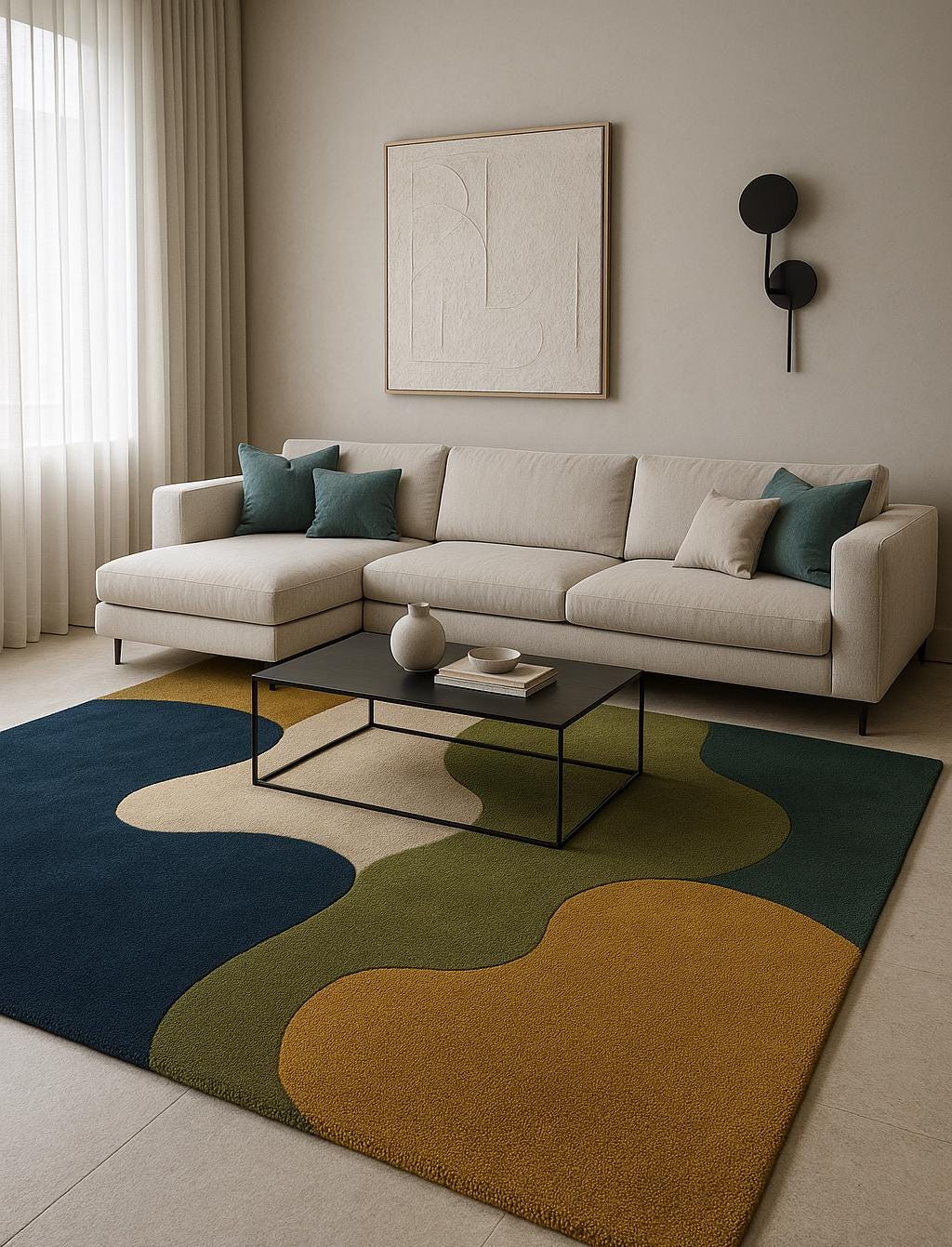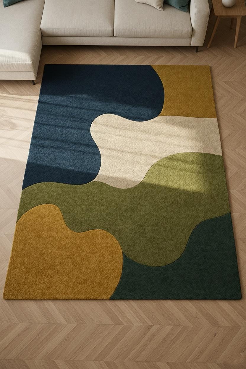 Add a bold yet calming statement to your space with this modern abstract hand-tufted rug, designed to elevate contemporary, mid-century, and minimalist interiors.