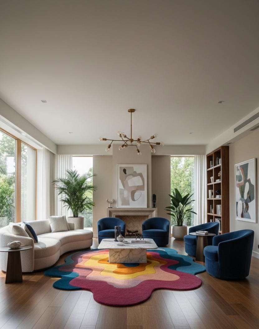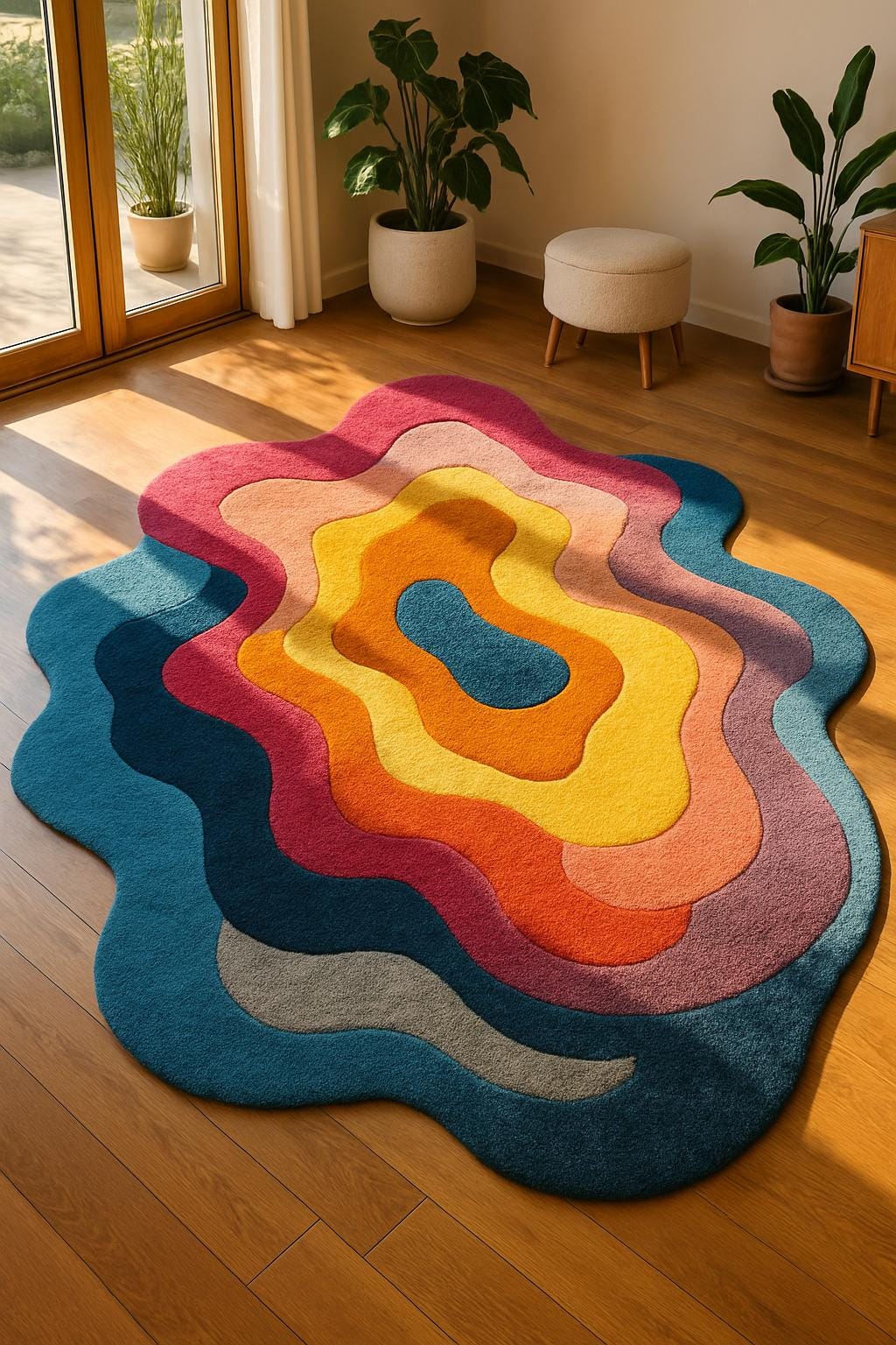 Add a bold artistic statement to your space with this modern abstract hand tufted rug, featuring a unique wavy organic shape and vibrant layered colors. Designed to elevate contemporary interiors, this rug blends comfort, creativity, and craftsmanship.