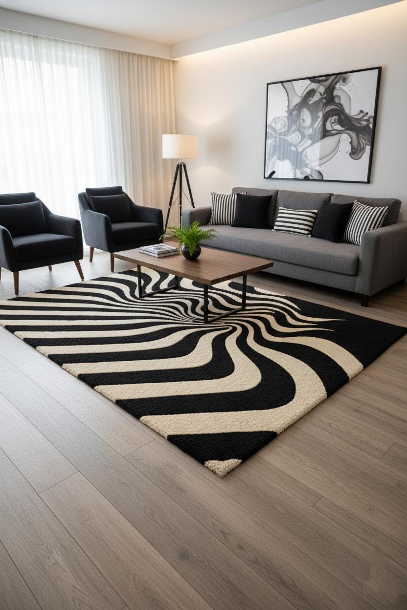 Bring bold modern style to your space with this abstract black and white area rug, featuring a striking wavy pattern that instantly elevates any room.