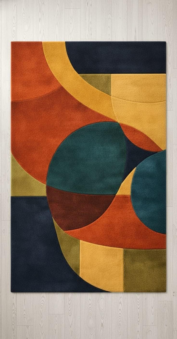 Bring bold character and modern elegance to your space with this handmade abstract geometric area rug. Designed with rich earthy tones and smooth curved patterns, this rug is perfect for modern, mid-century, contemporary, and artistic interiors.
