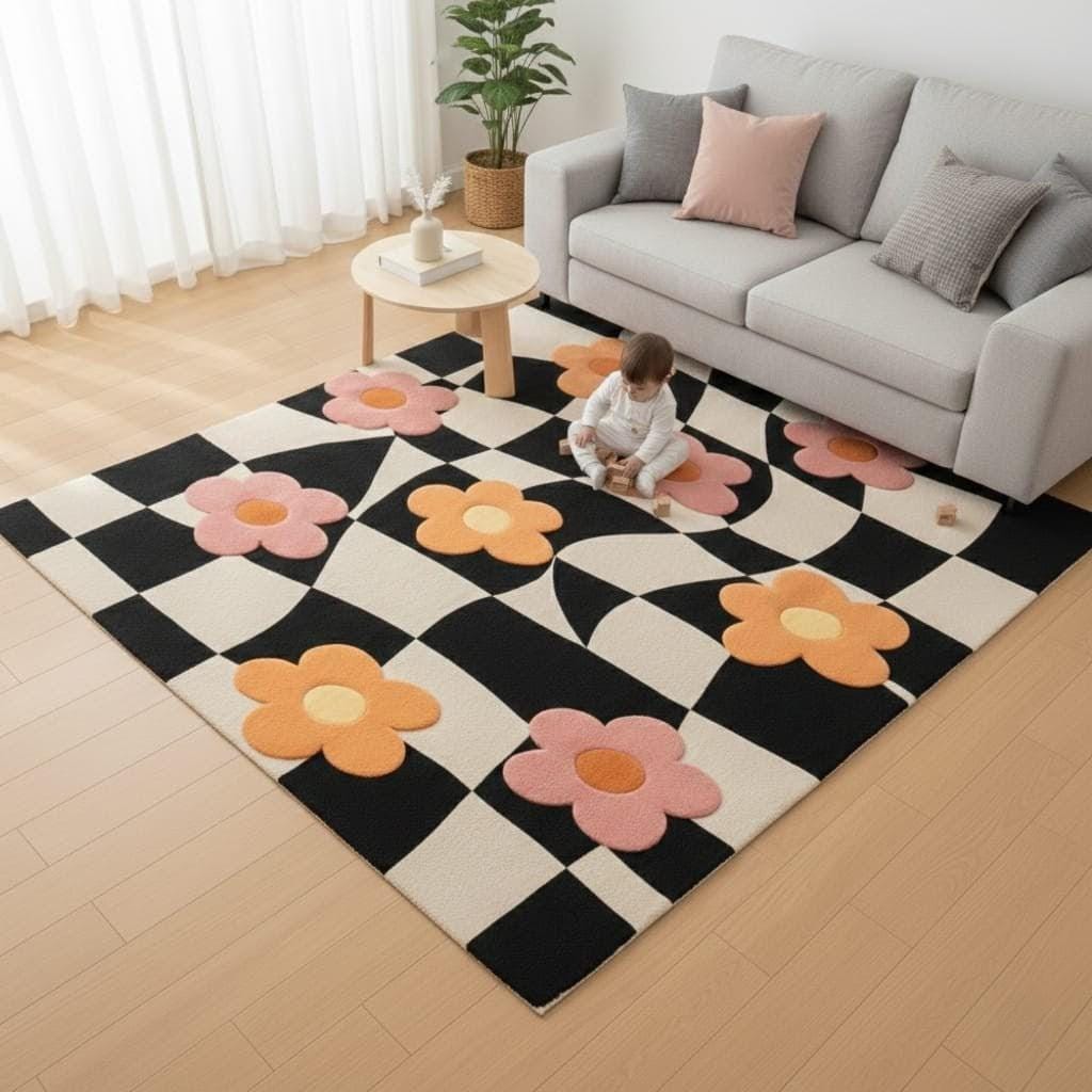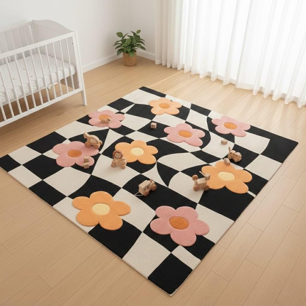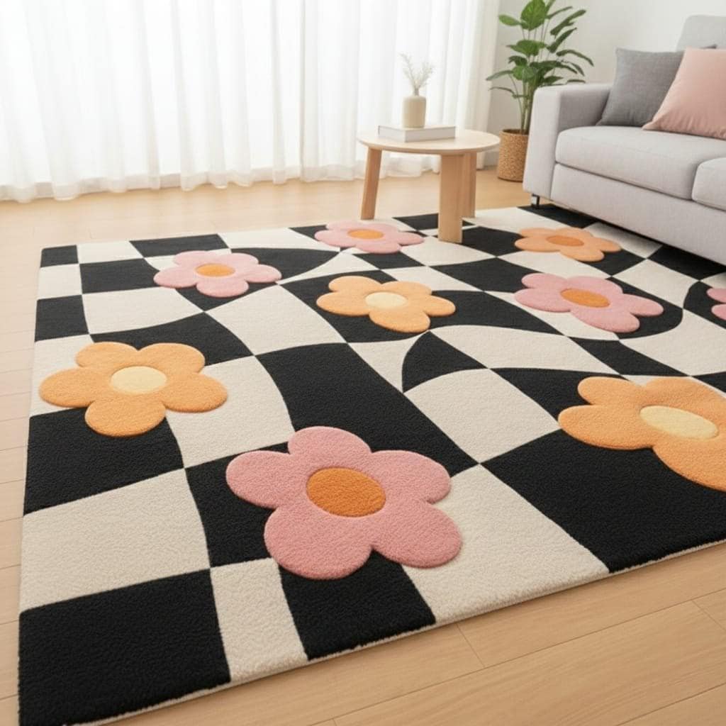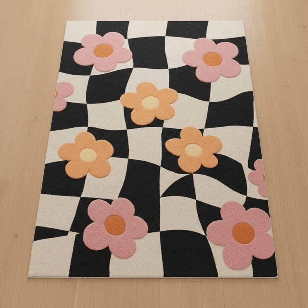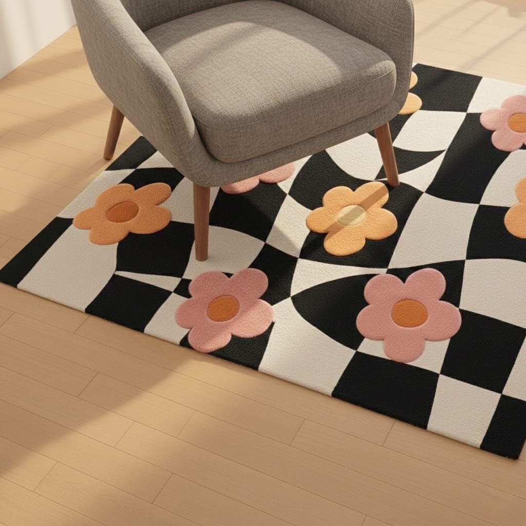 A perfect blend of black & white checkerboard with soft pink and peach floral motifs, this rug instantly elevates living rooms, kids’ rooms, nurseries, and aesthetic interiors.