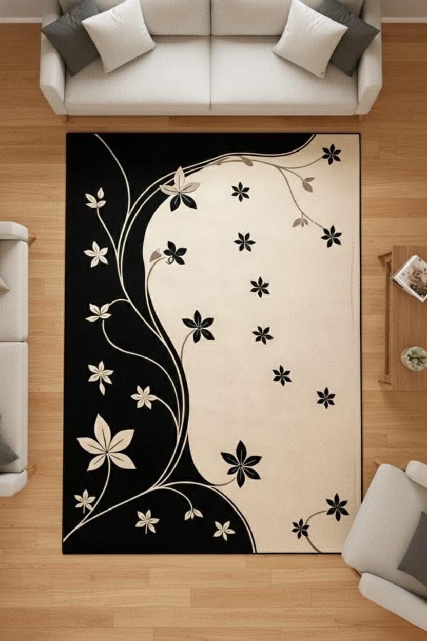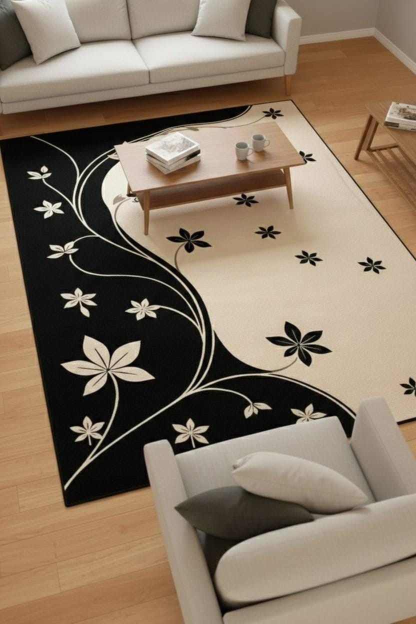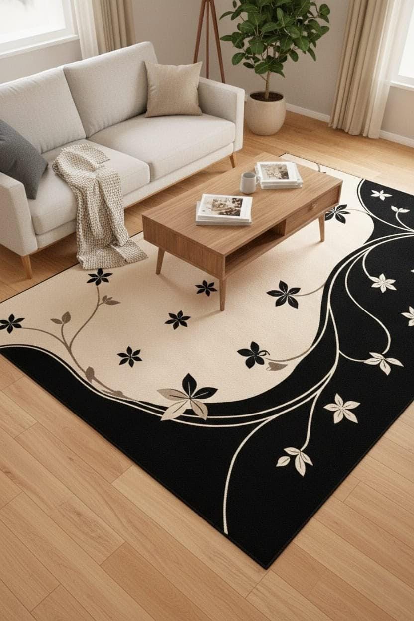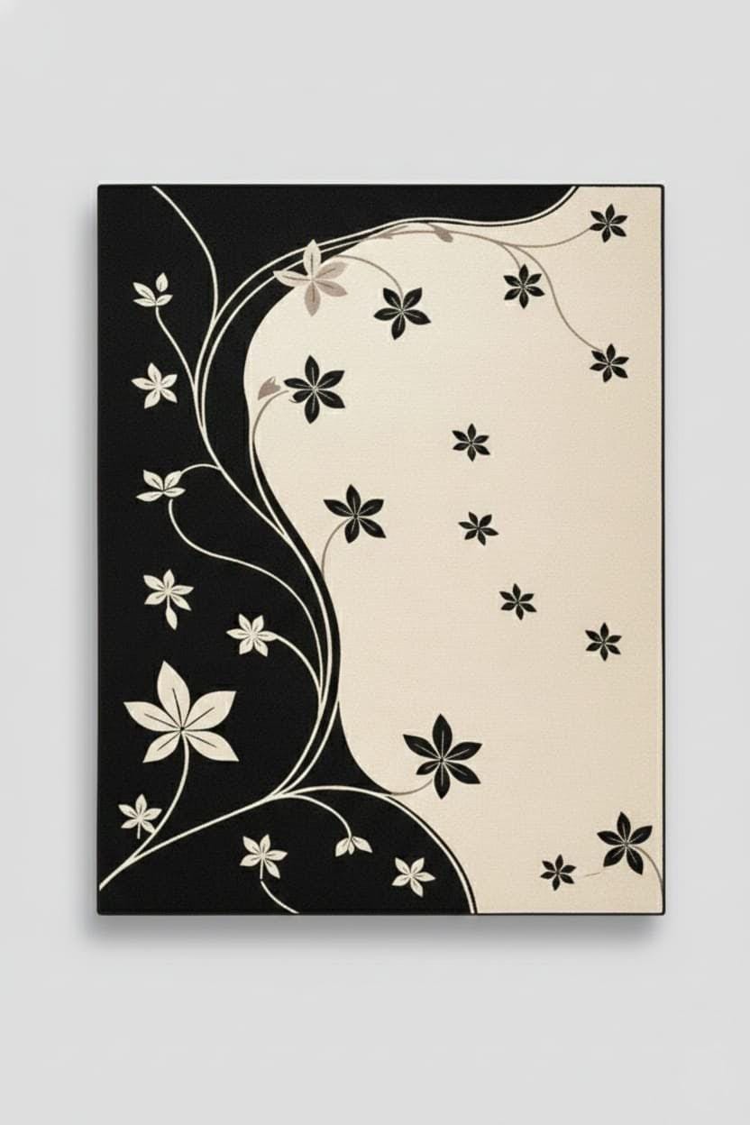Upgrade your space with this modern black and ivory floral area rug, designed to bring elegance and calm to any room. The flowing vine pattern with delicate floral motifs creates a minimal yet luxurious look, perfect for modern, contemporary, and minimalist interiors.