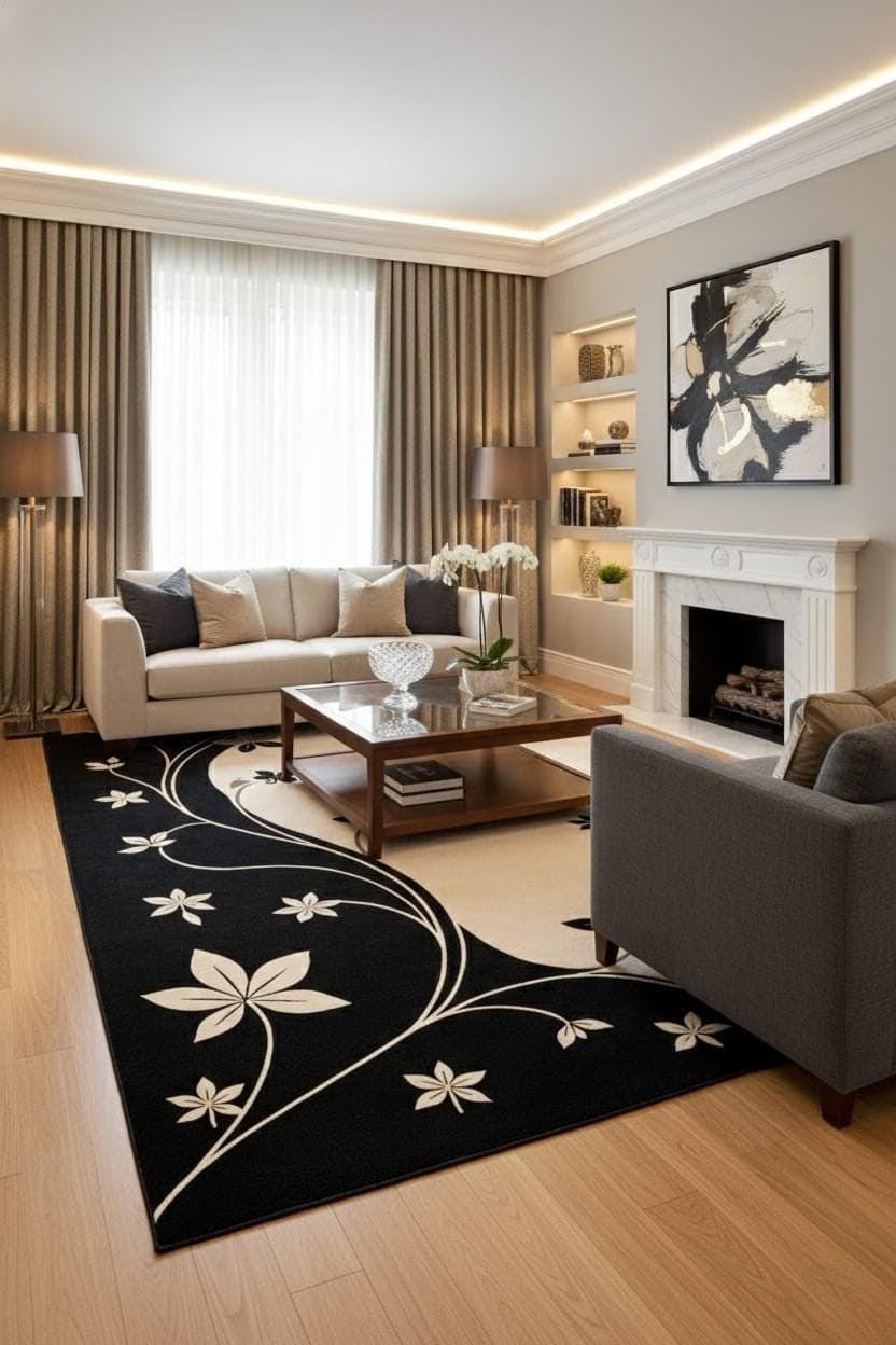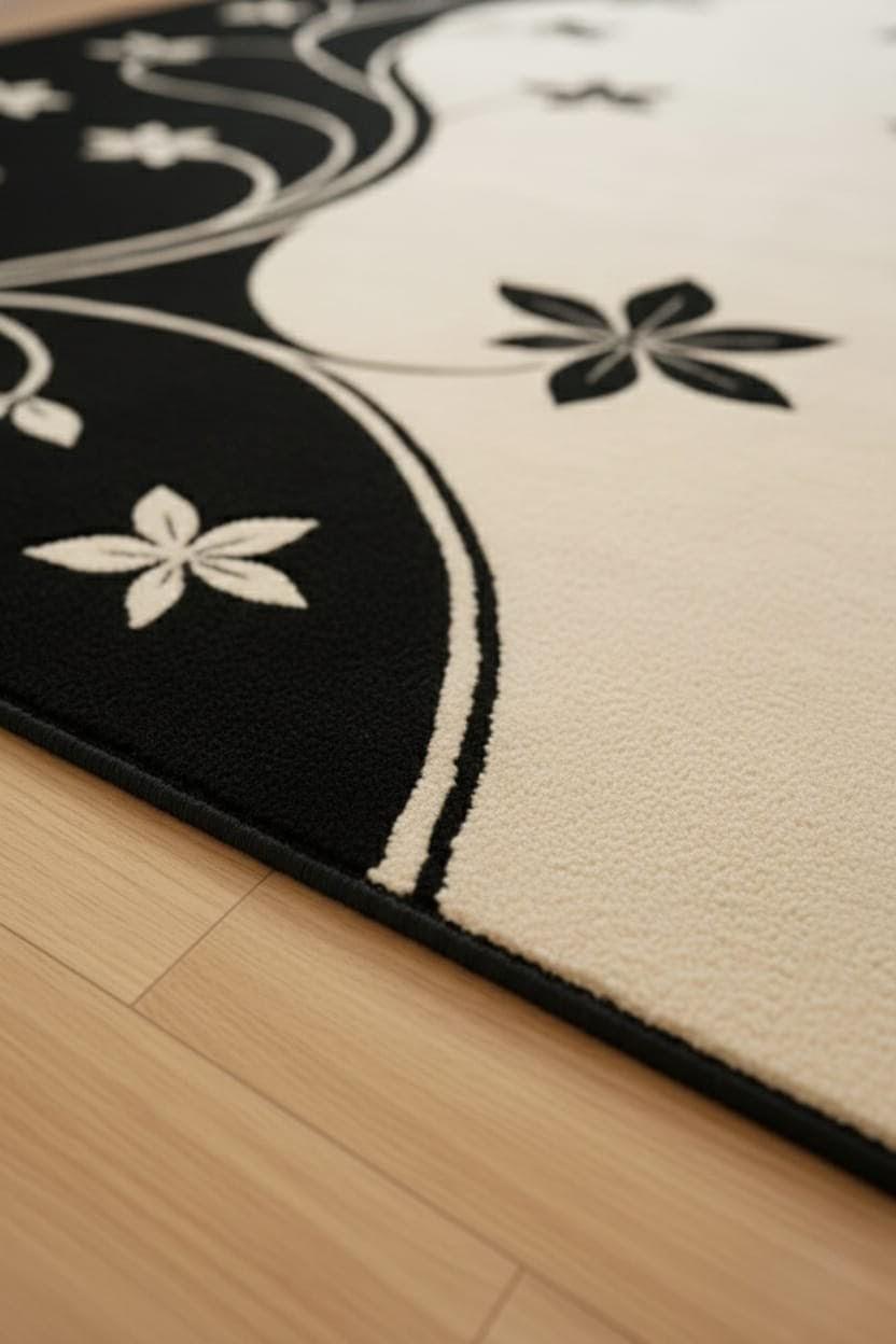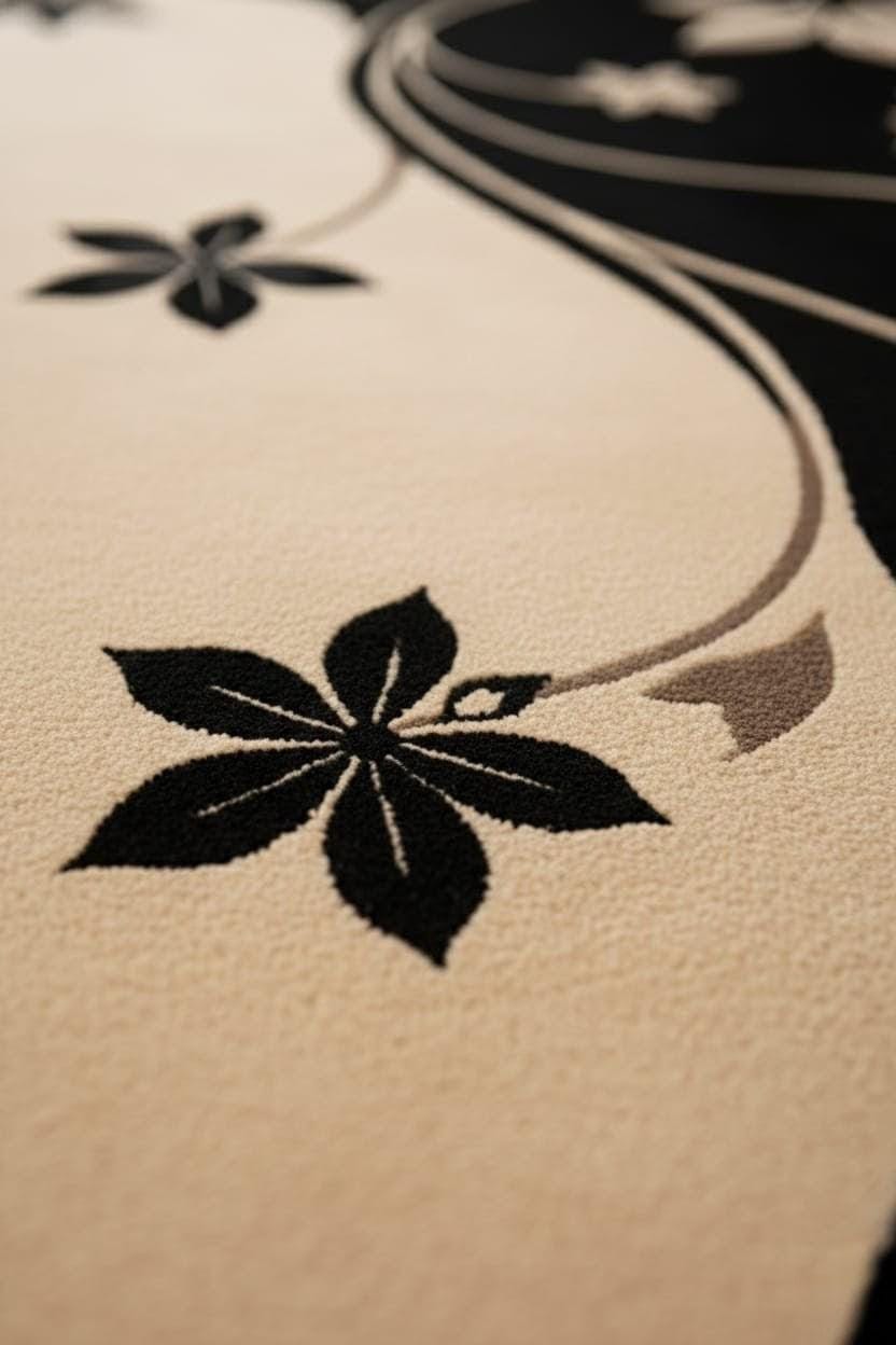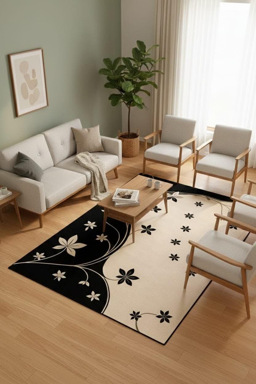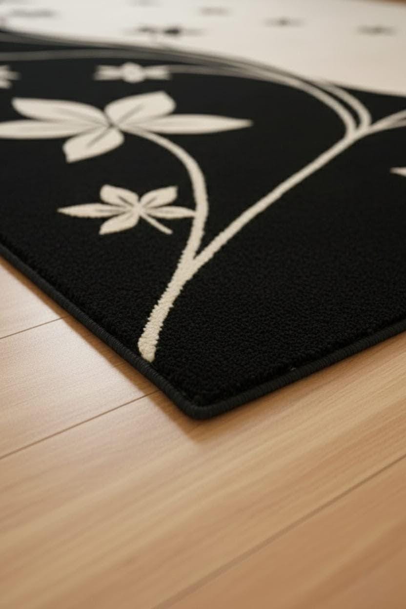 Upgrade your space with this modern black and ivory floral area rug, designed to bring elegance and calm to any room. The flowing vine pattern with delicate floral motifs creates a minimal yet luxurious look, perfect for modern, contemporary, and minimalist interiors.