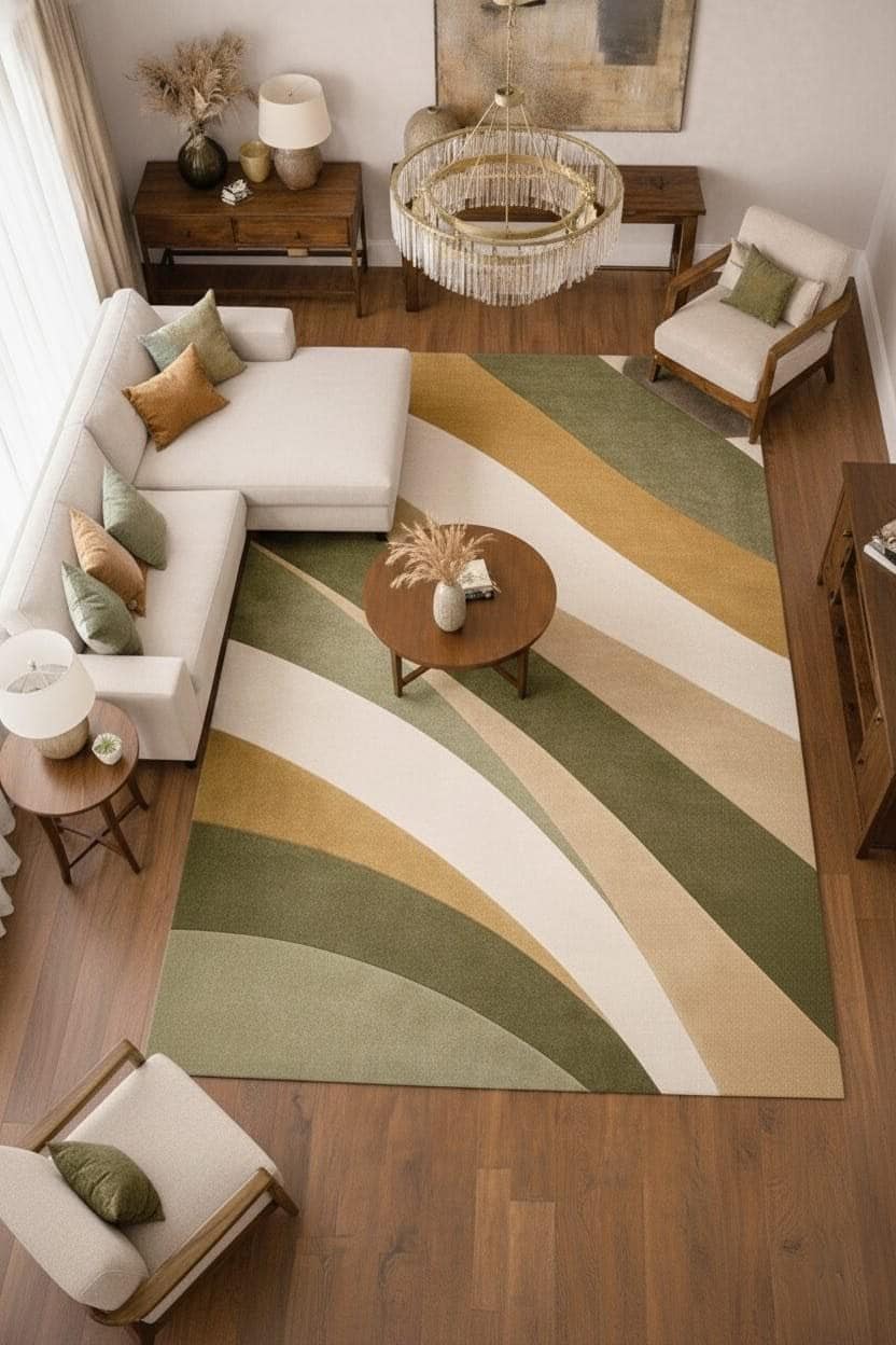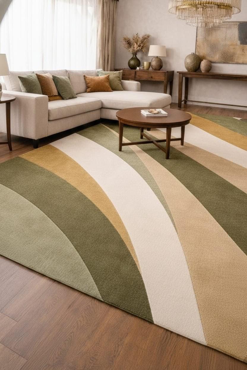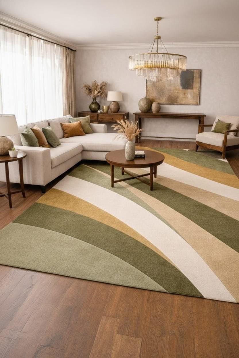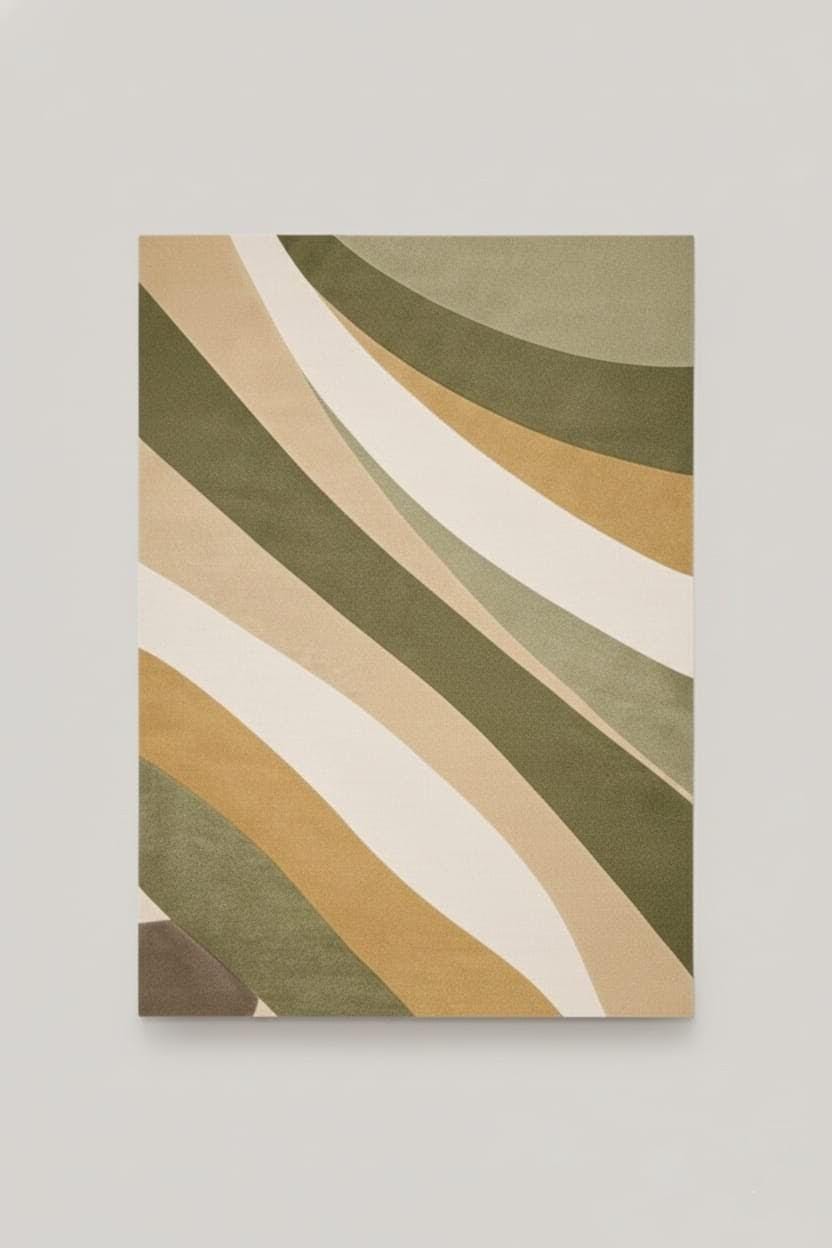 Upgrade your space with this modern abstract area rug, designed to bring warmth, elegance, and a contemporary touch to your home. Featuring soothing green, beige, and neutral tones with flowing geometric patterns, this rug perfectly complements modern, minimalist, and boho interiors.