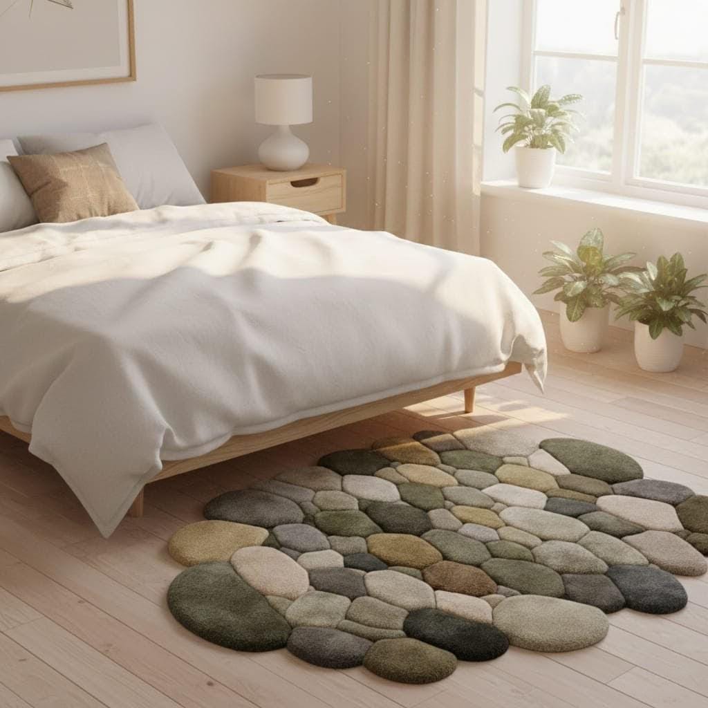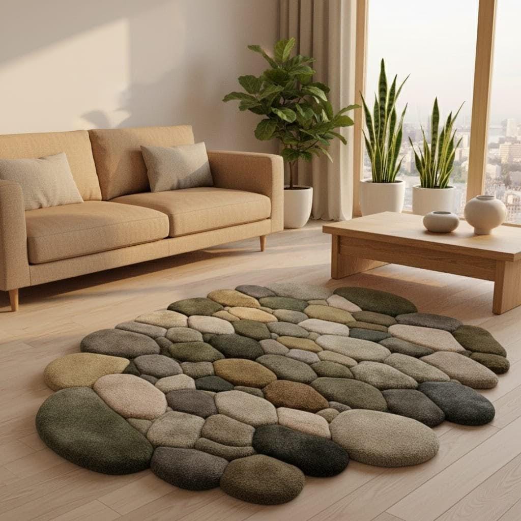Hand Tufted Pebble Rug, Organic Stone Shape Area Carpet, Neutral Earth Tone Wool Rug, Modern Japandi Living Room Decor