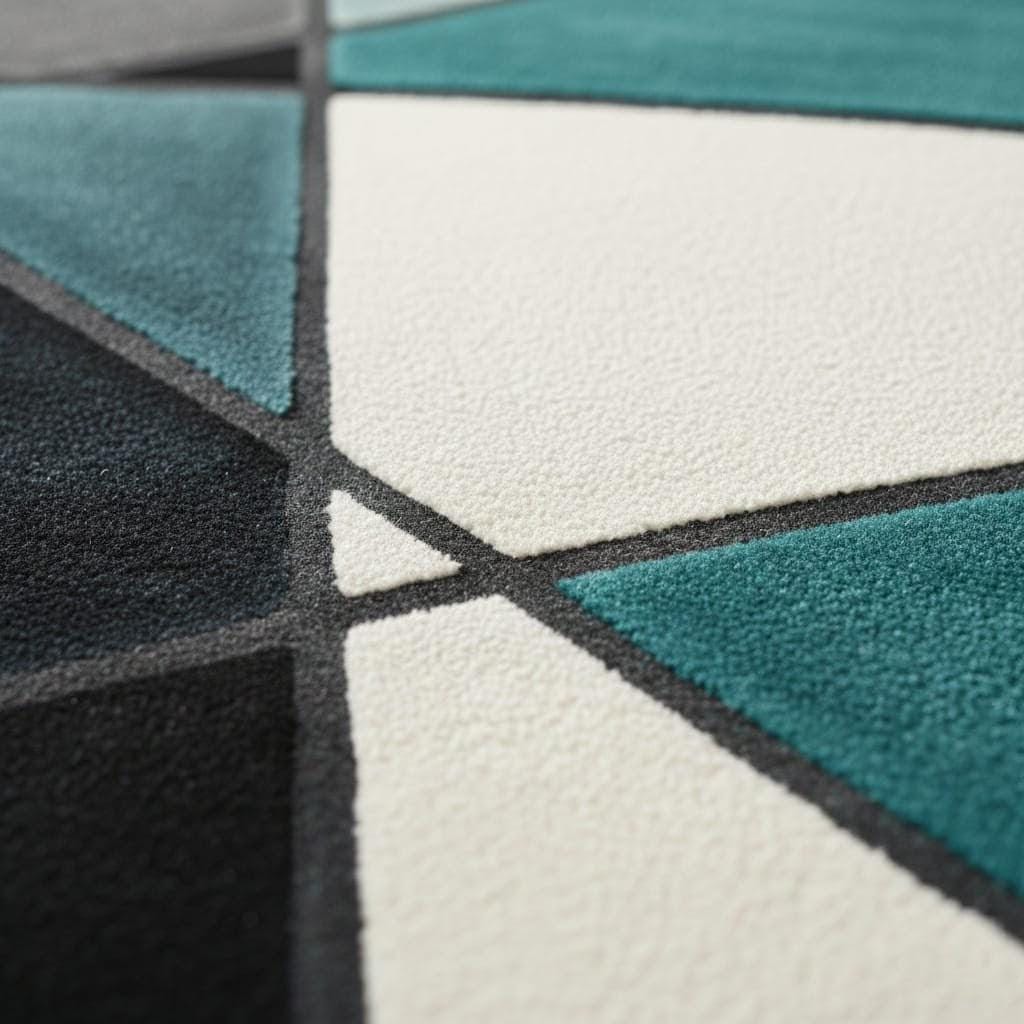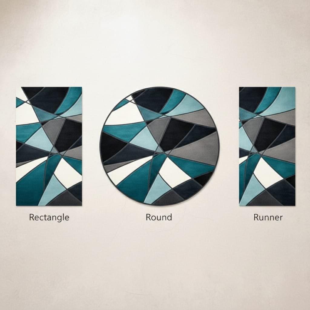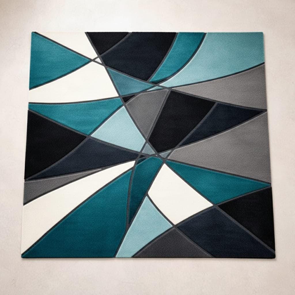 Upgrade your space with this bold Modern Geometric Area Rug featuring abstract shapes in teal, black, grey and ivory tones. Designed to create a statement in your living room, bedroom or office, this contemporary rug blends mid-century style with modern minimal aesthetics.