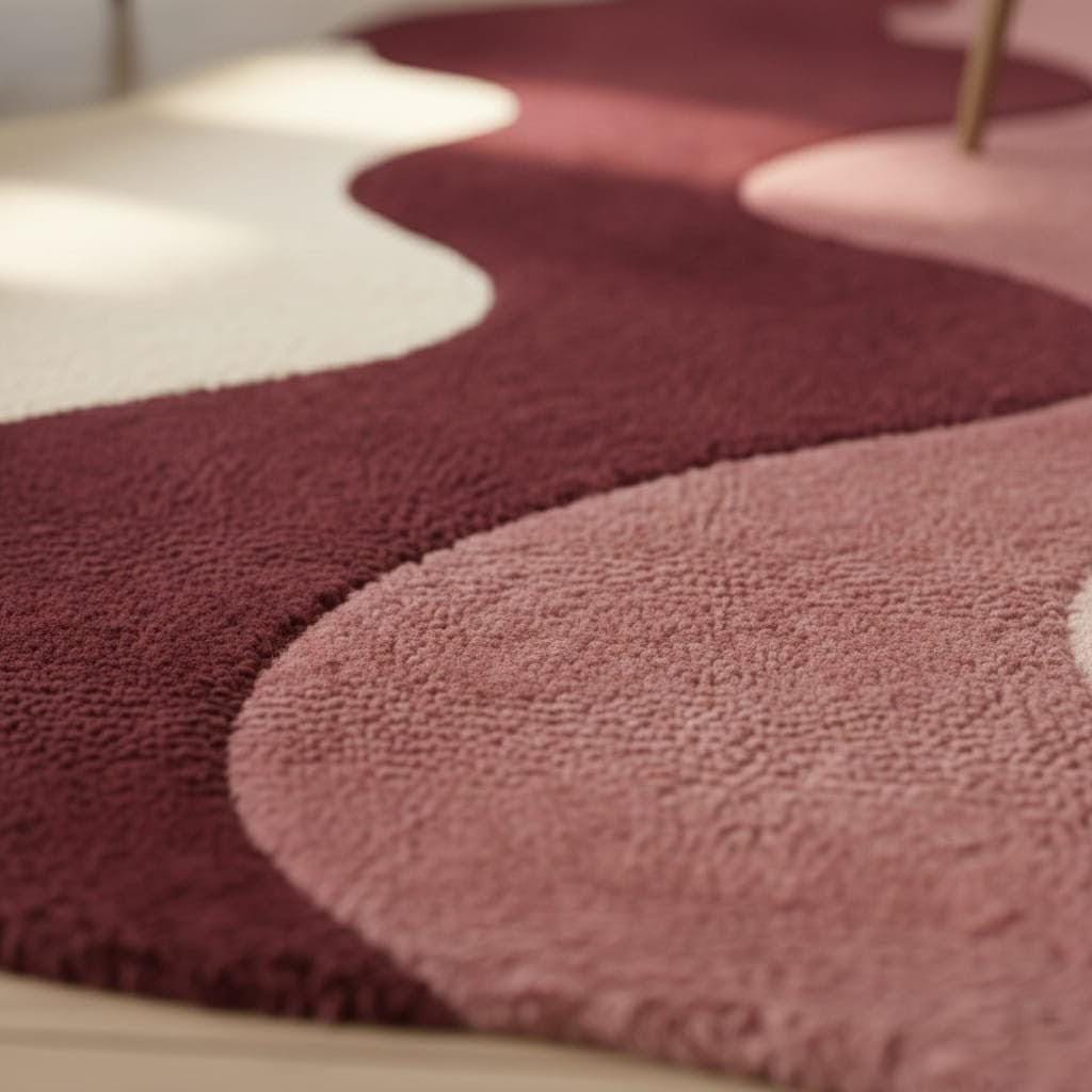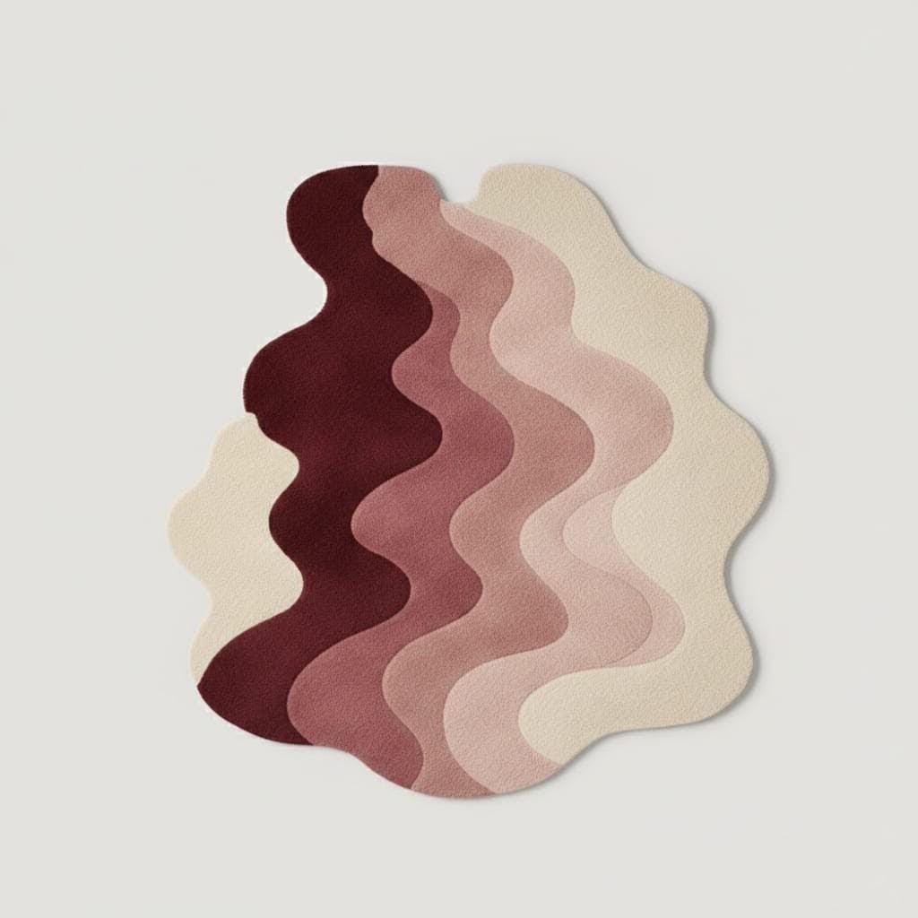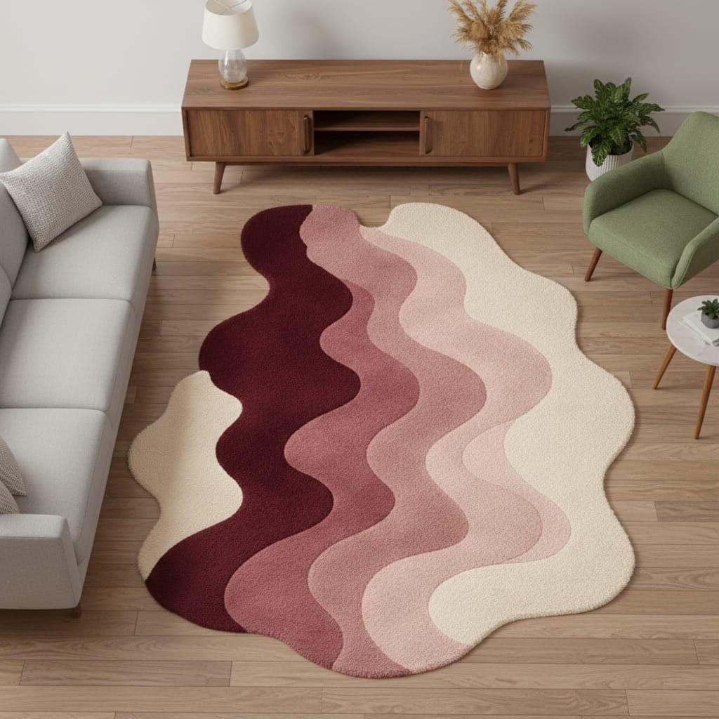 Bring warmth and artistic elegance to your space with this modern abstract irregular shape rug featuring beautiful wavy layers in burgundy, blush pink, and cream tones. This hand tufted style rug adds a sculptural, contemporary touch to any living room, bedroom, or studio space.