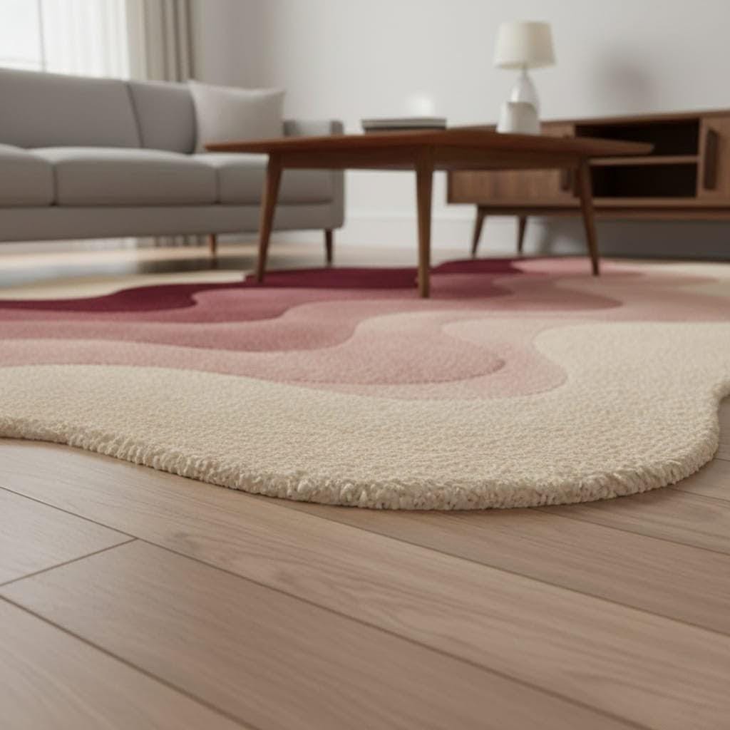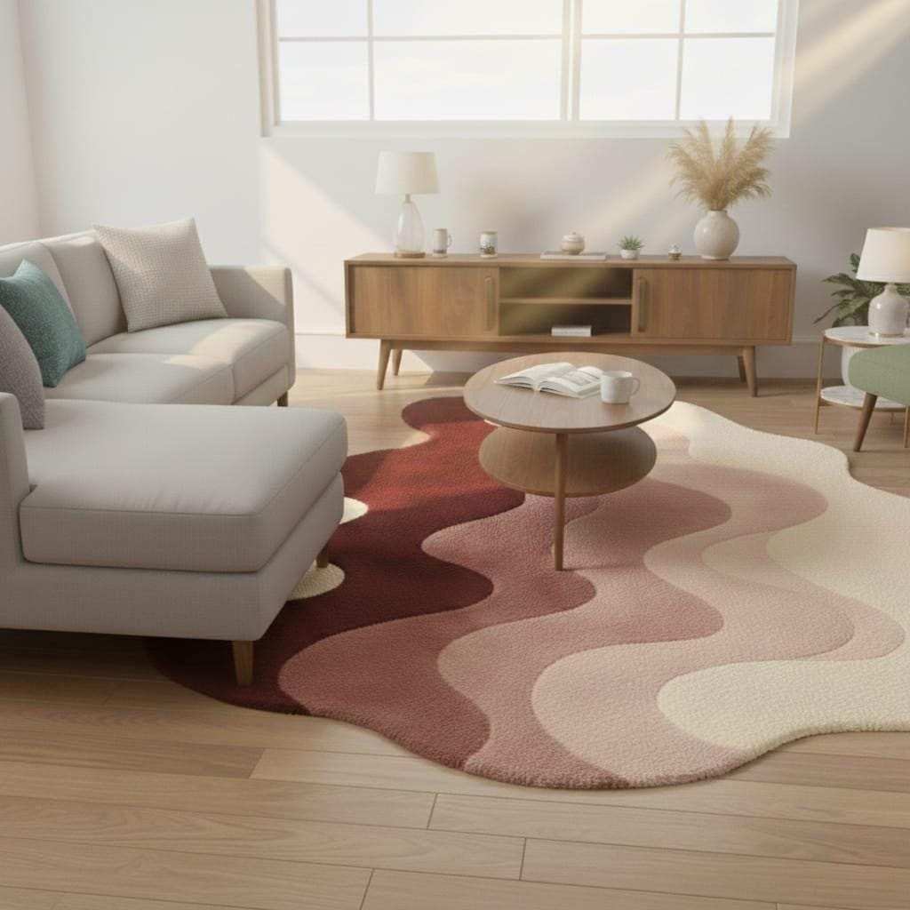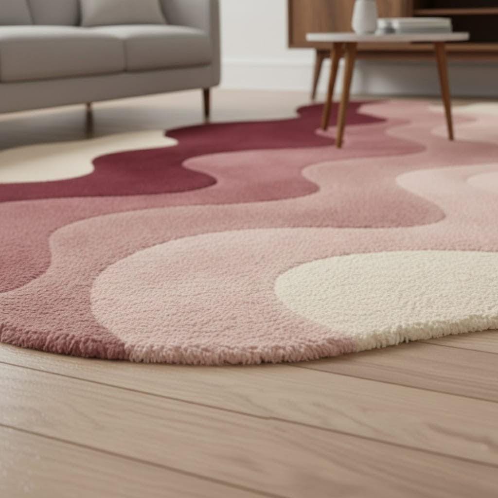 Bring warmth and artistic elegance to your space with this modern abstract irregular shape rug featuring beautiful wavy layers in burgundy, blush pink, and cream tones. This hand tufted style rug adds a sculptural, contemporary touch to any living room, bedroom, or studio space.