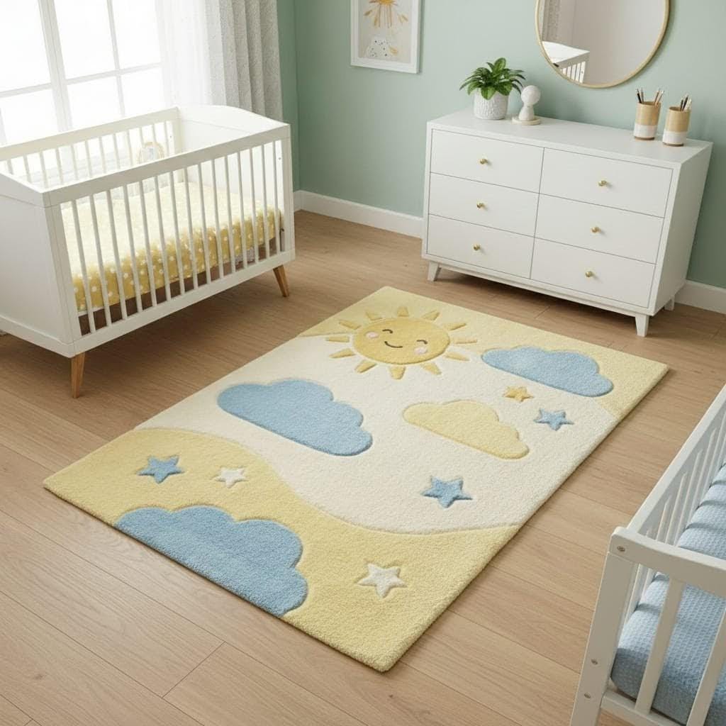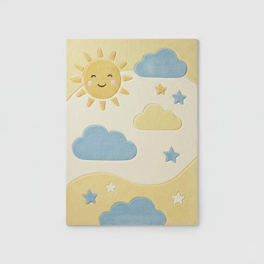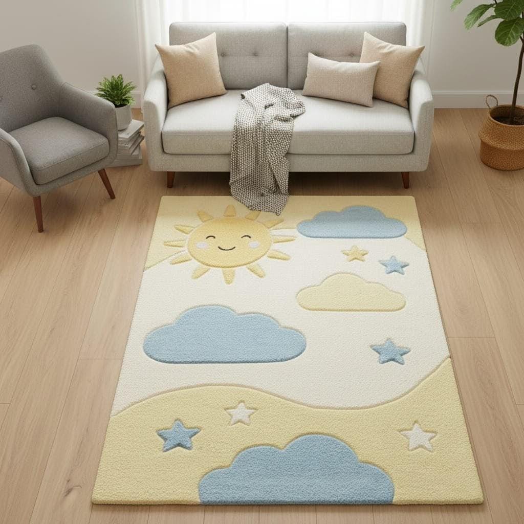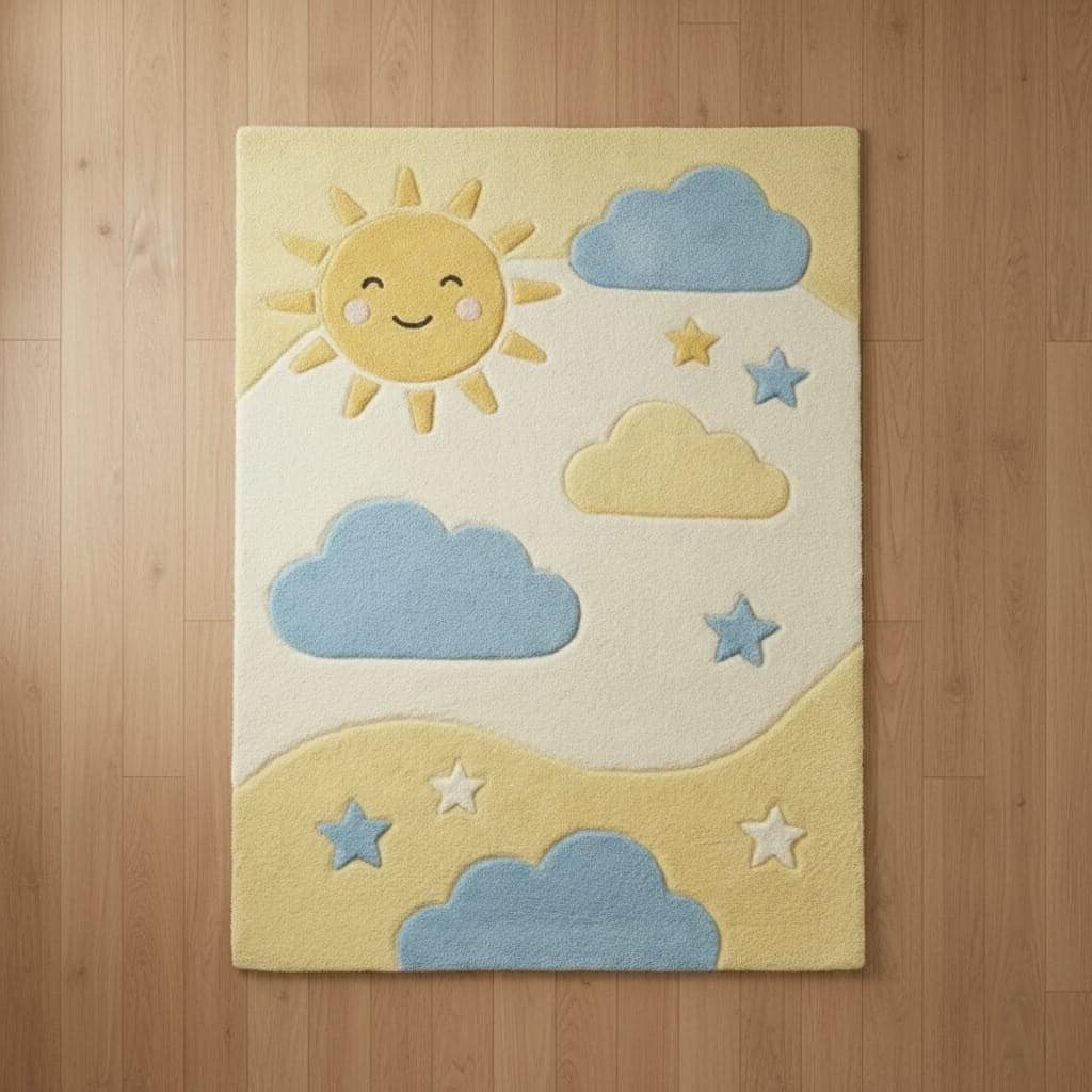 Bring warmth and happiness into your little one’s room with this adorable Sun and Cloud Nursery Rug. Featuring a smiling sun, soft blue clouds, and star accents in calming pastel tones, this rug creates a cozy and cheerful space for babies and toddlers.