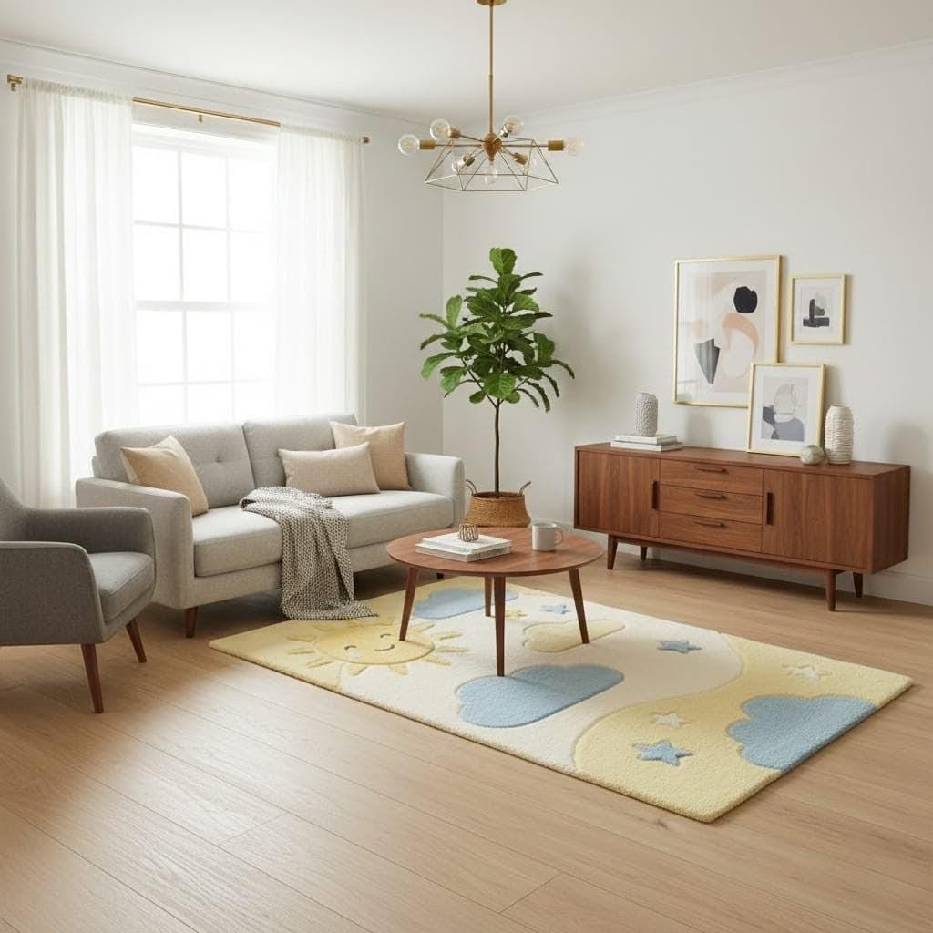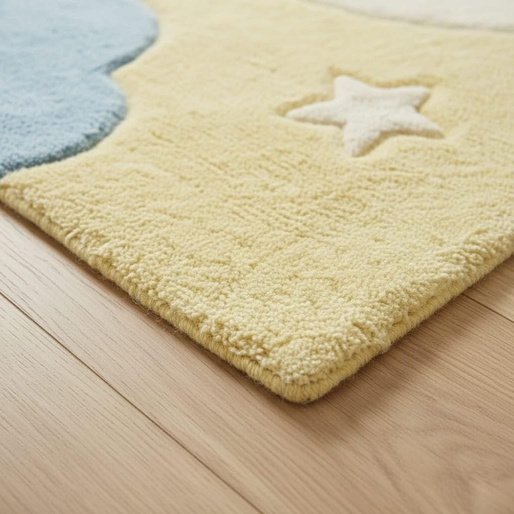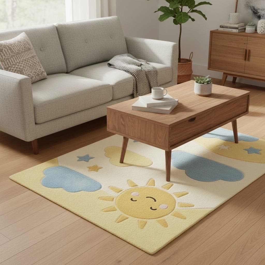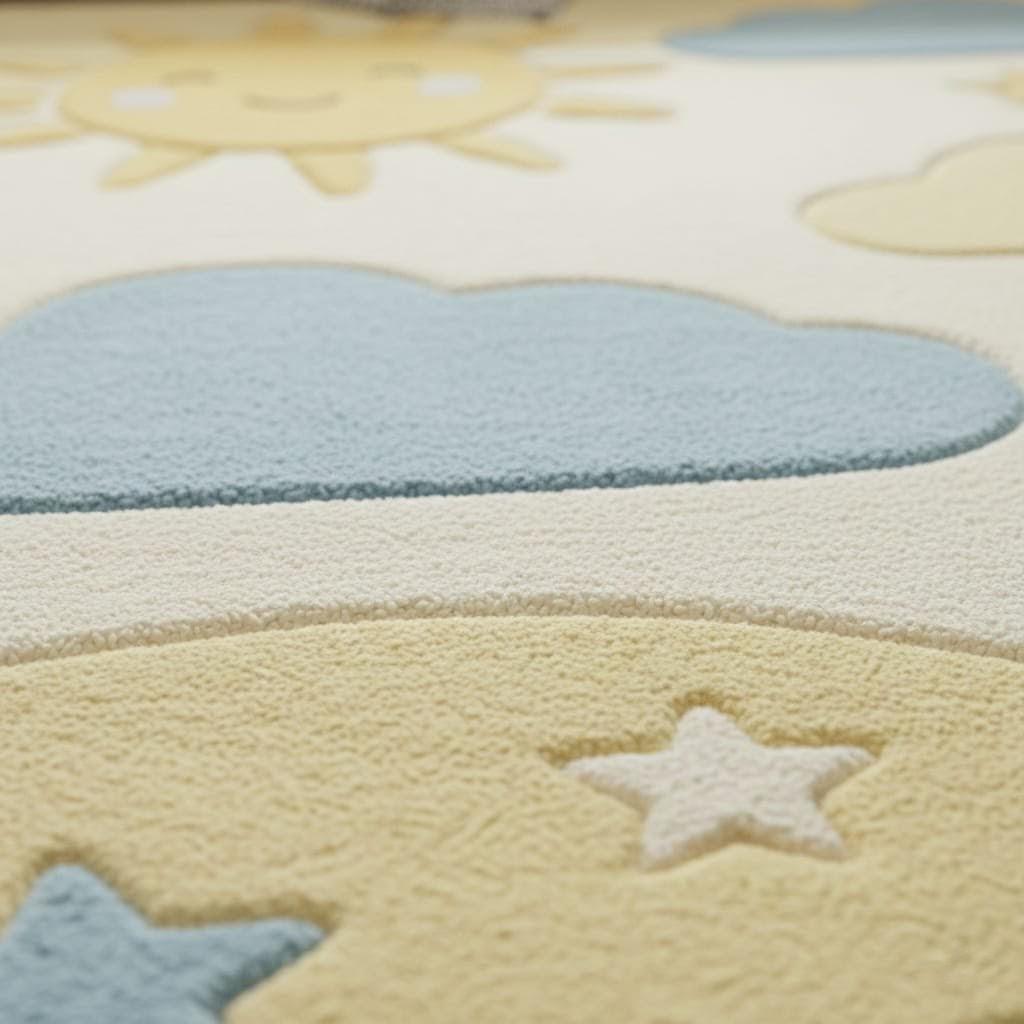Bring warmth and happiness into your little one’s room with this adorable Sun and Cloud Nursery Rug. Featuring a smiling sun, soft blue clouds, and star accents in calming pastel tones, this rug creates a cozy and cheerful space for babies and toddlers.