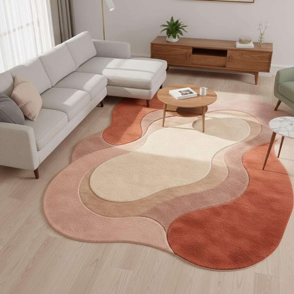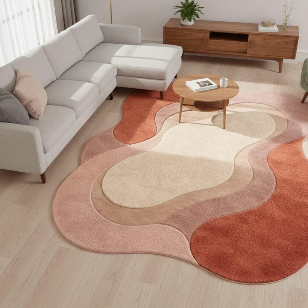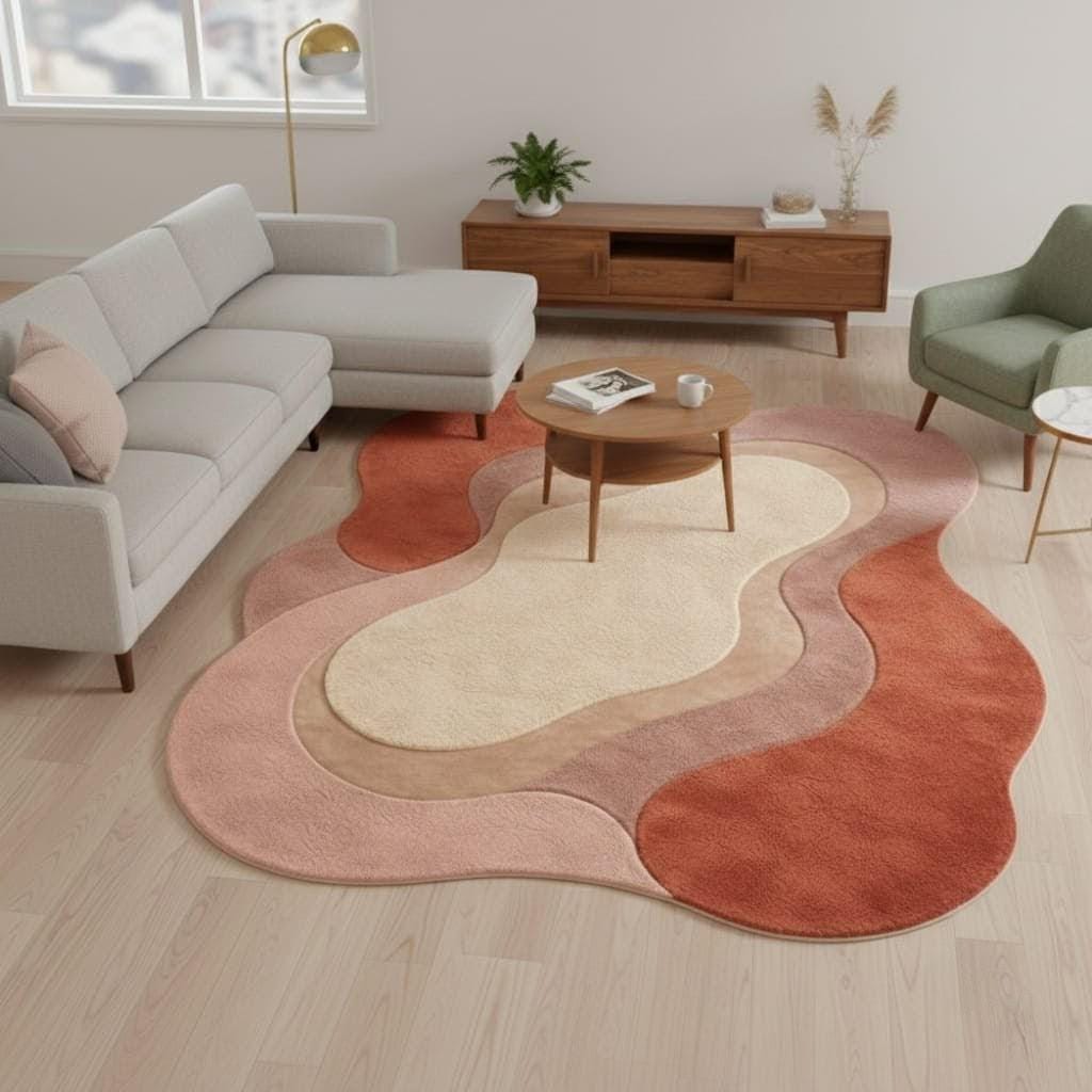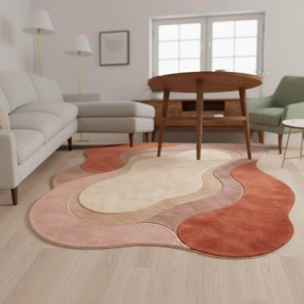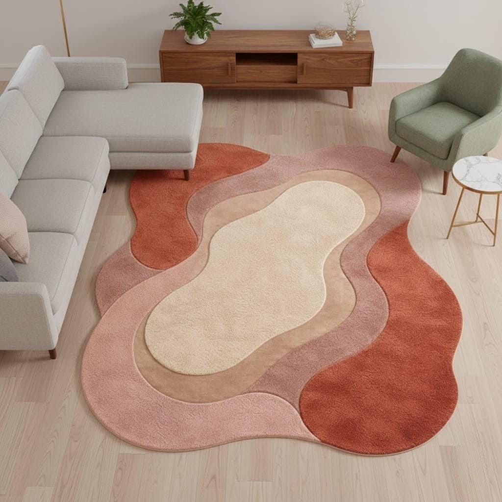 Upgrade your space with this modern abstract irregular shape rug, designed as a true piece of sculptural floor art. Featuring layered organic curves in warm terracotta, blush pink, beige, and cream tones, this contemporary rug brings softness, depth, and movement to any living space.