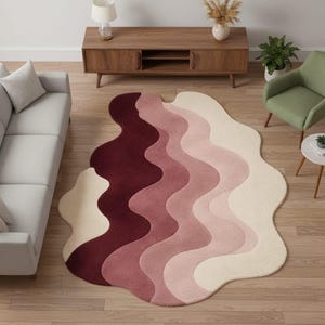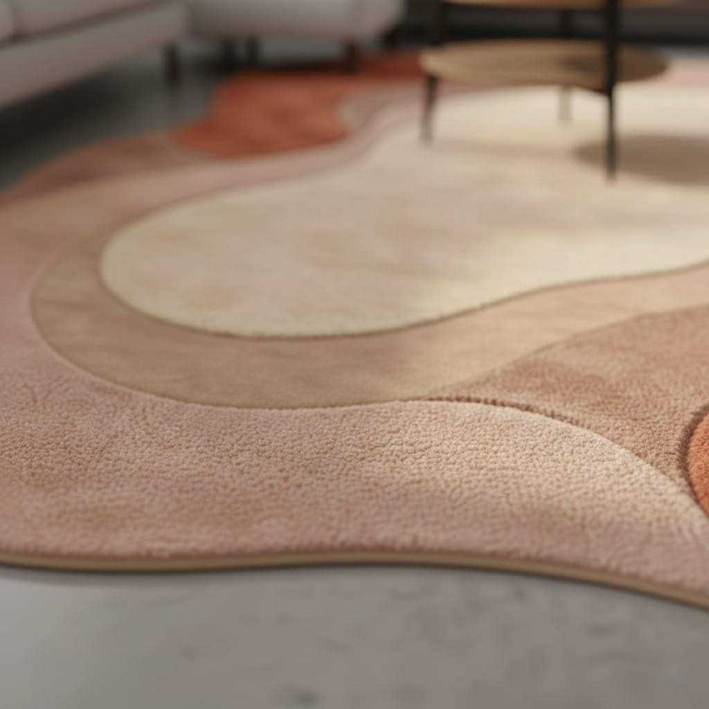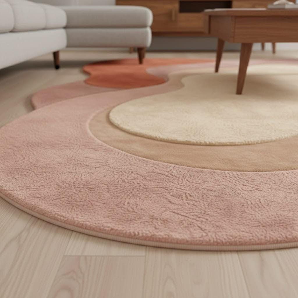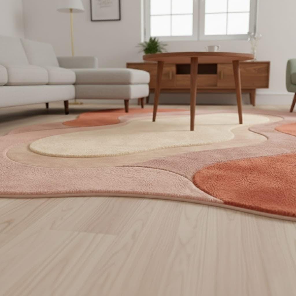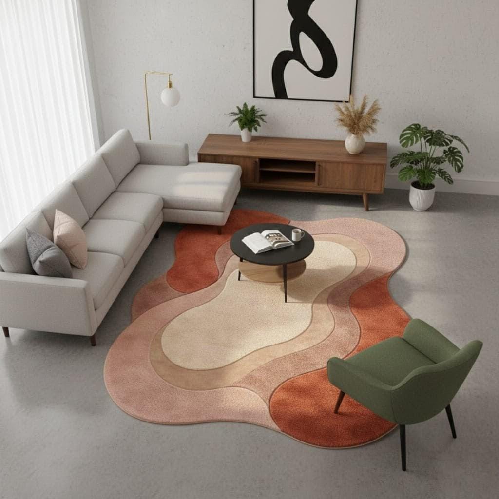 Upgrade your space with this modern abstract irregular shape rug, designed as a true piece of sculptural floor art. Featuring layered organic curves in warm terracotta, blush pink, beige, and cream tones, this contemporary rug brings softness, depth, and movement to any living space.