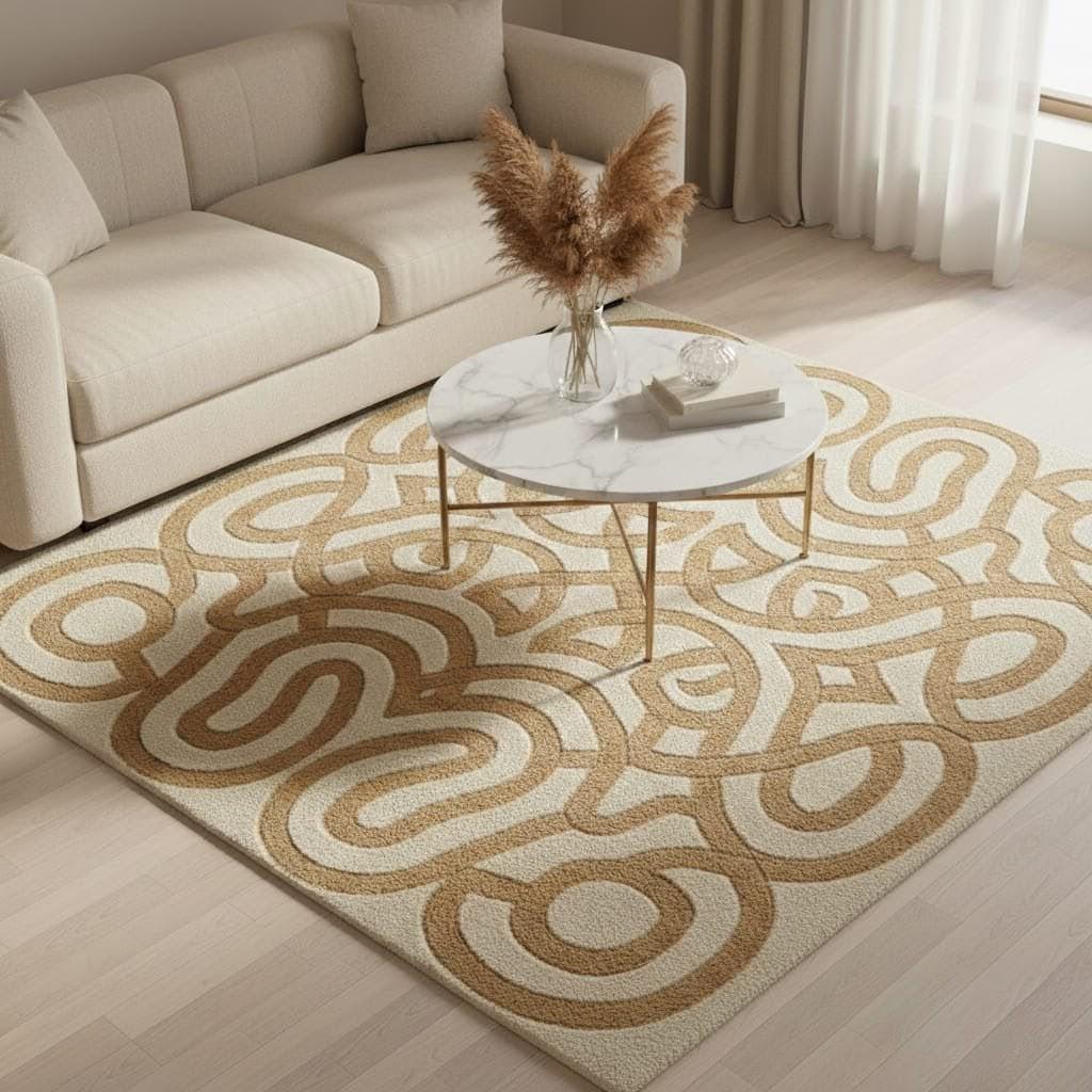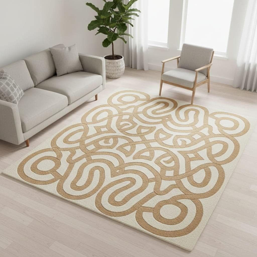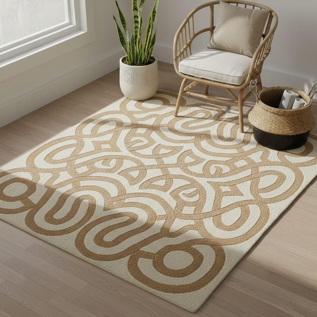 Bring warmth and modern elegance to your space with this Hand Tufted Modern Abstract Rug in soothing beige and cream tones. Featuring a bold geometric swirl pattern, this contemporary area rug adds artistic charm and texture to any living room, bedroom, or office.