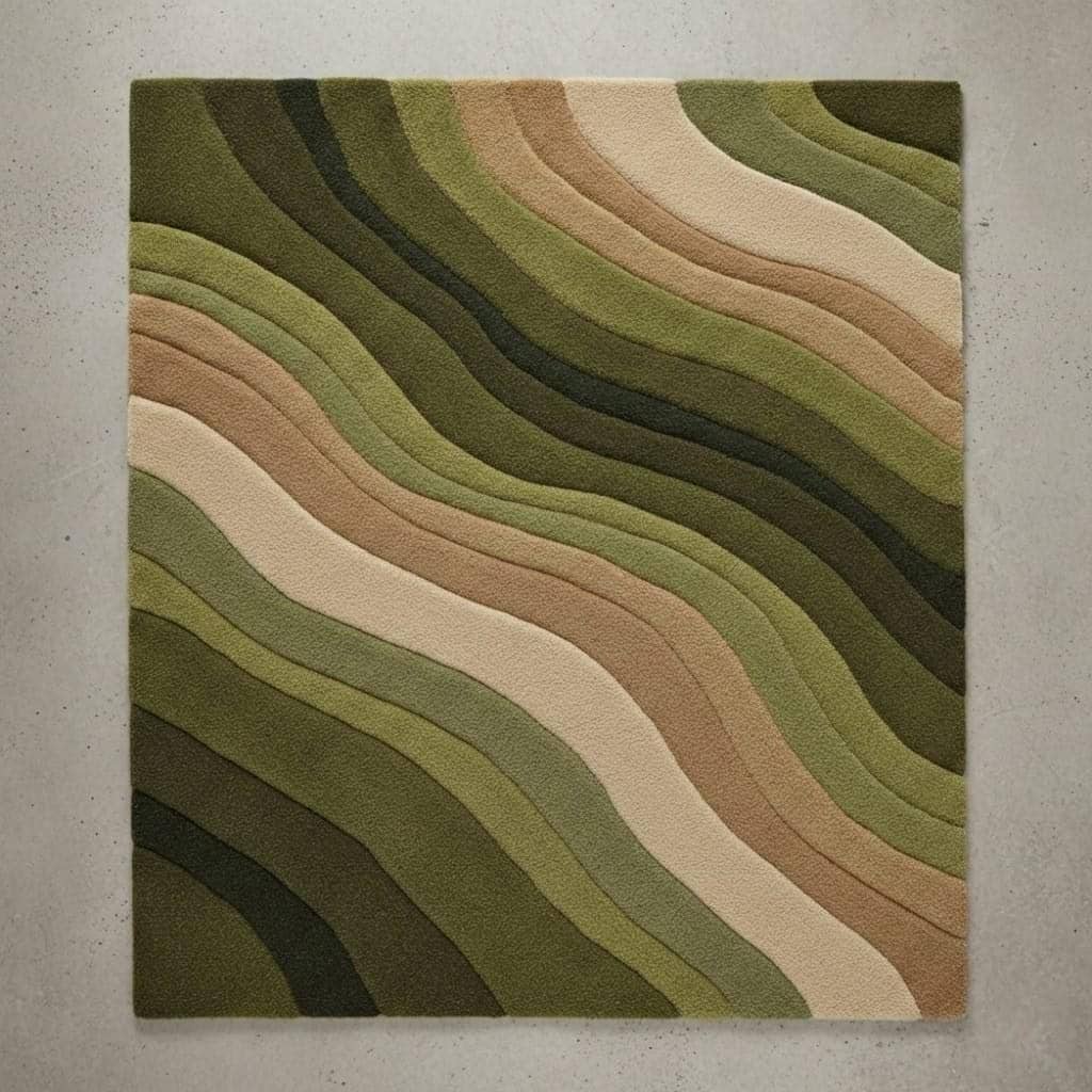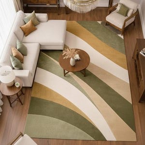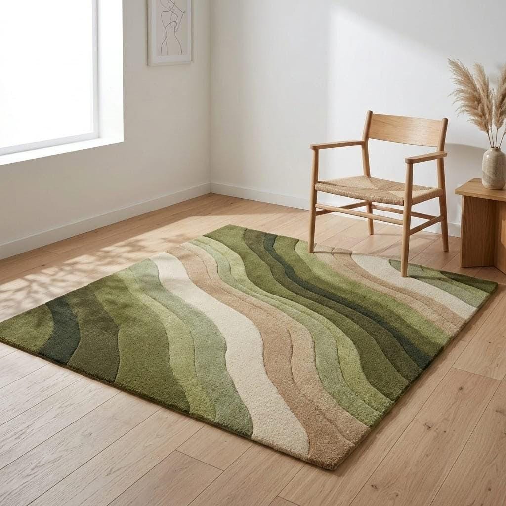 Green Abstract Wave Rug, Modern Boho Area Rug, Earth Tone Hand Tufted Carpet, Sage Olive Beige Living Room Rug, Contemporary Floor Decor