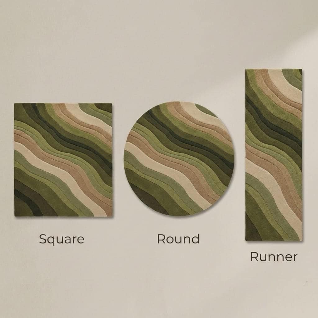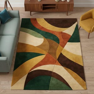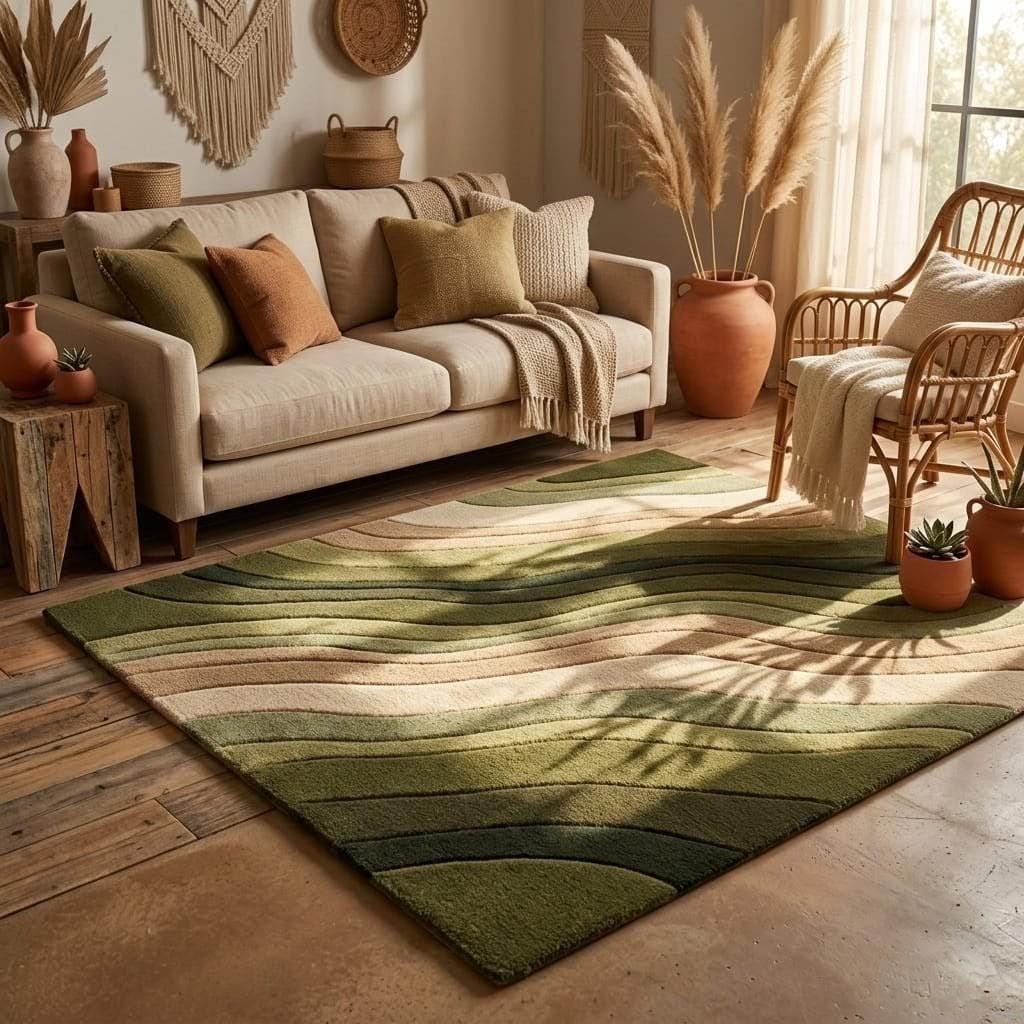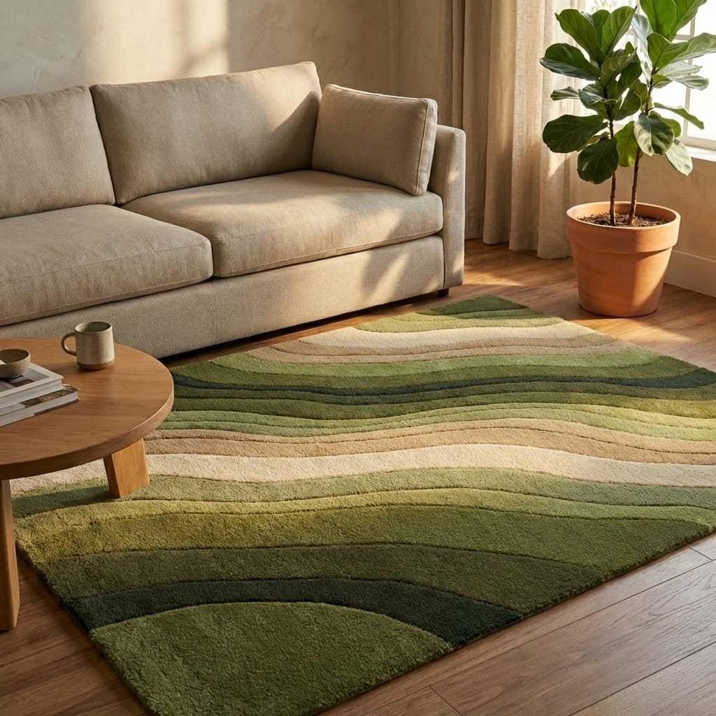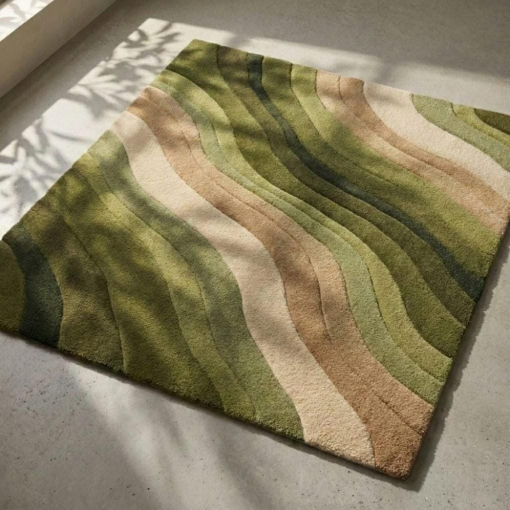 "Bring nature-inspired elegance into your home with this stunning Green Abstract Wave Rug. Featuring layered tones of sage, olive, moss, beige, and cream, this modern hand-tufted rug creates a calming, organic flow in any space.